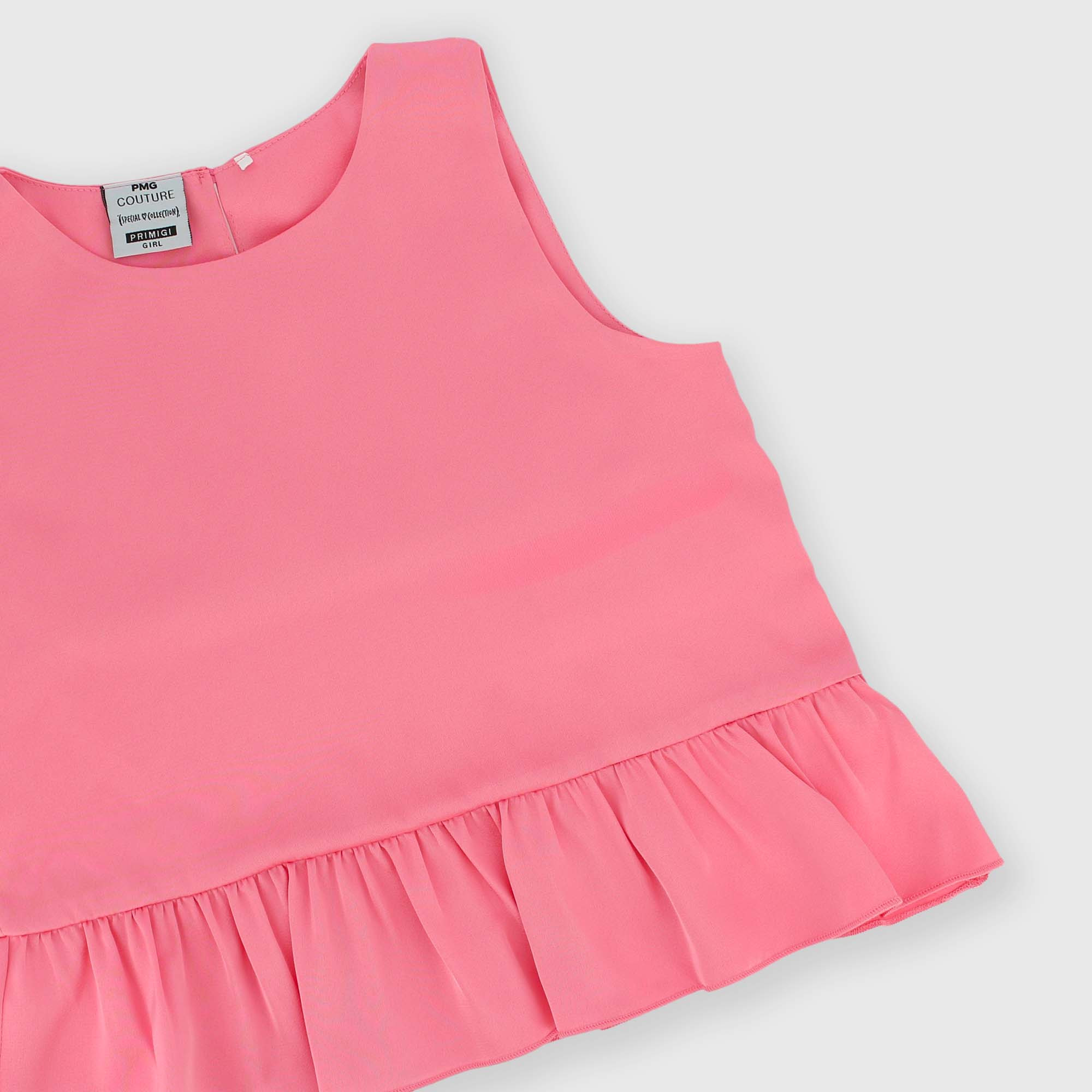Two-piece suit. Blouse, crew neck, armholes. Teardrop closure with button on the back. Volant to the bottom. Wide leg trousers with elasticated waistband.