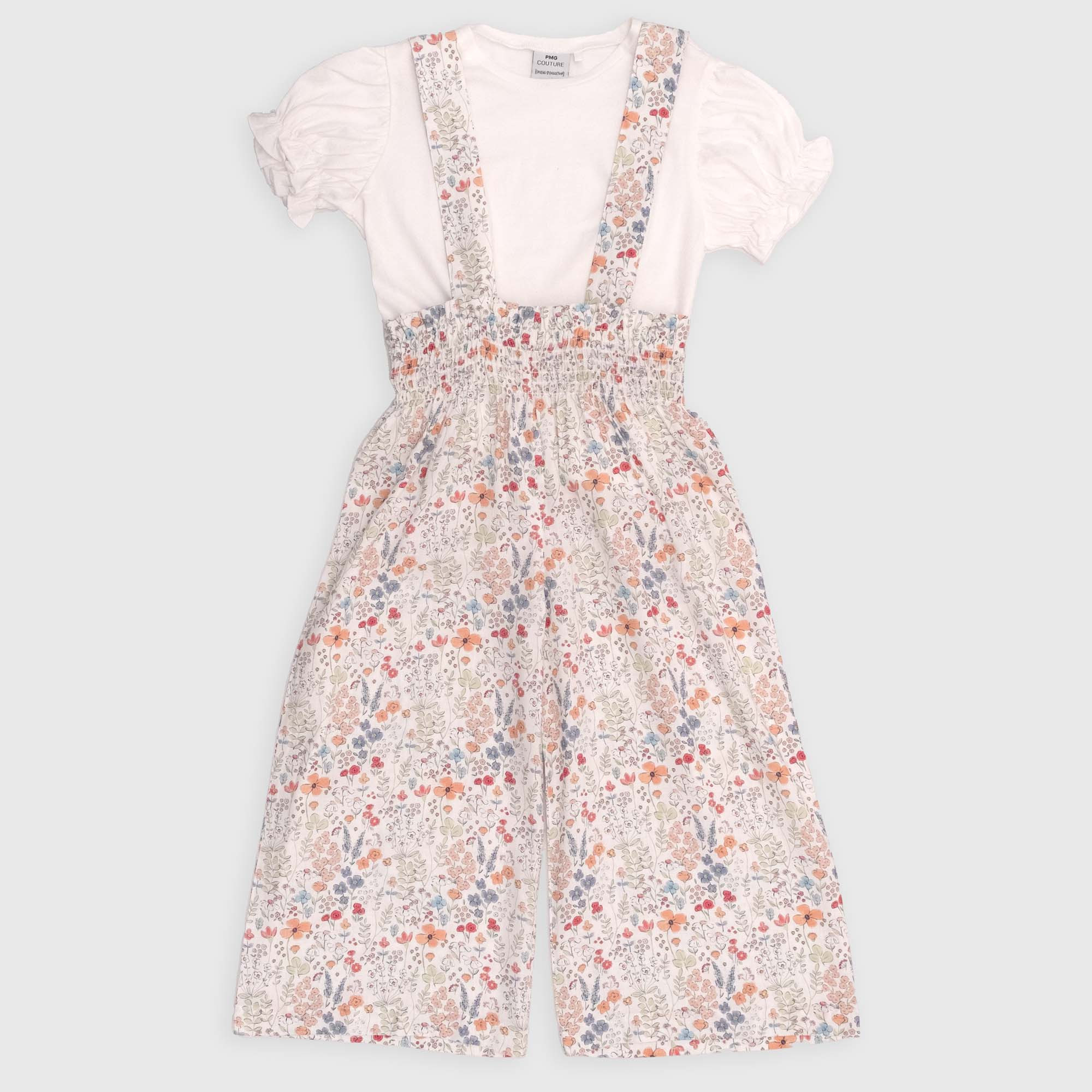 Two-piece suit. Jersey T-shirt, crew neck, with short balloon sleeves. Wide leg viscose salopette with elasticated waistband. Adjustable suspenders with internal buttons. All-over print with flowers.