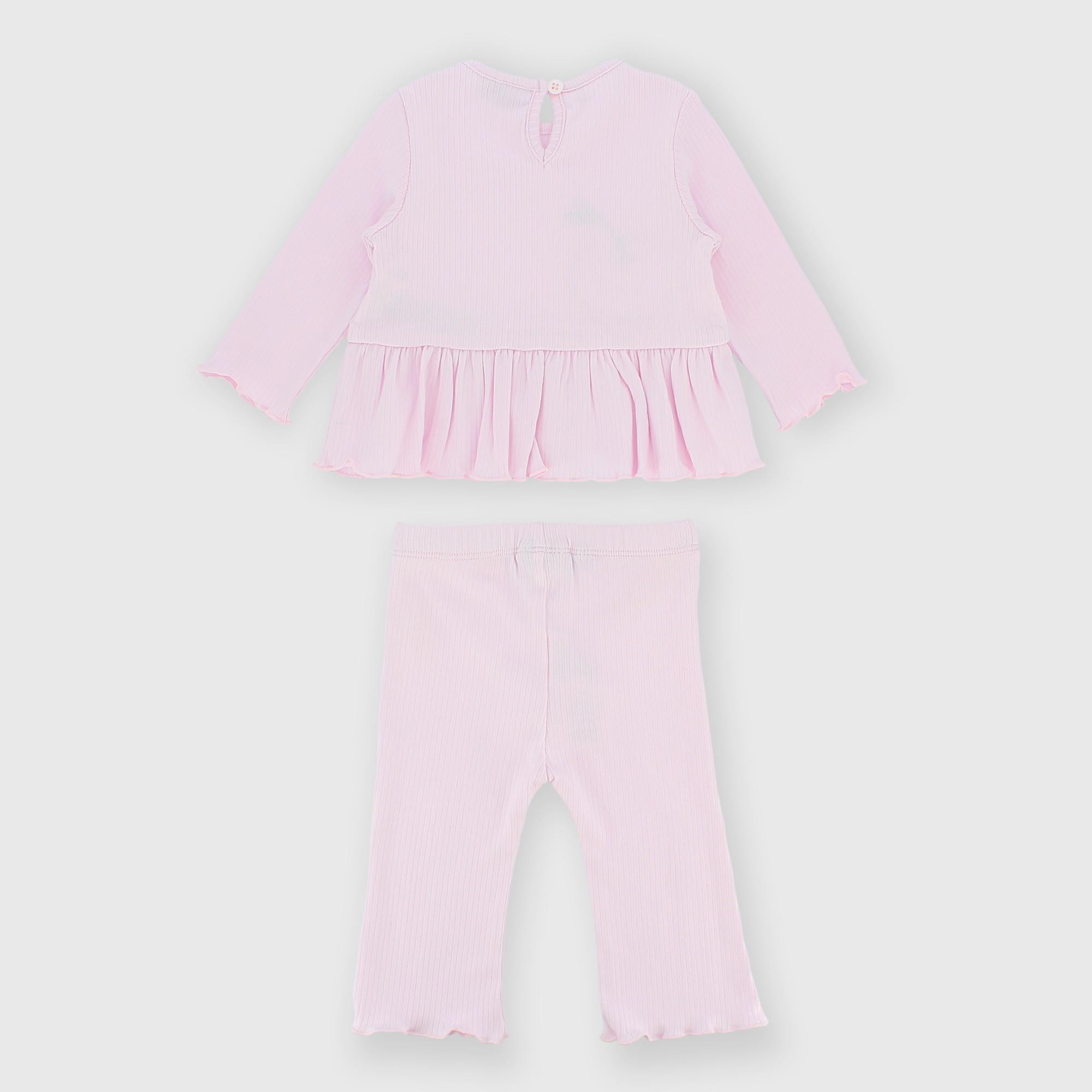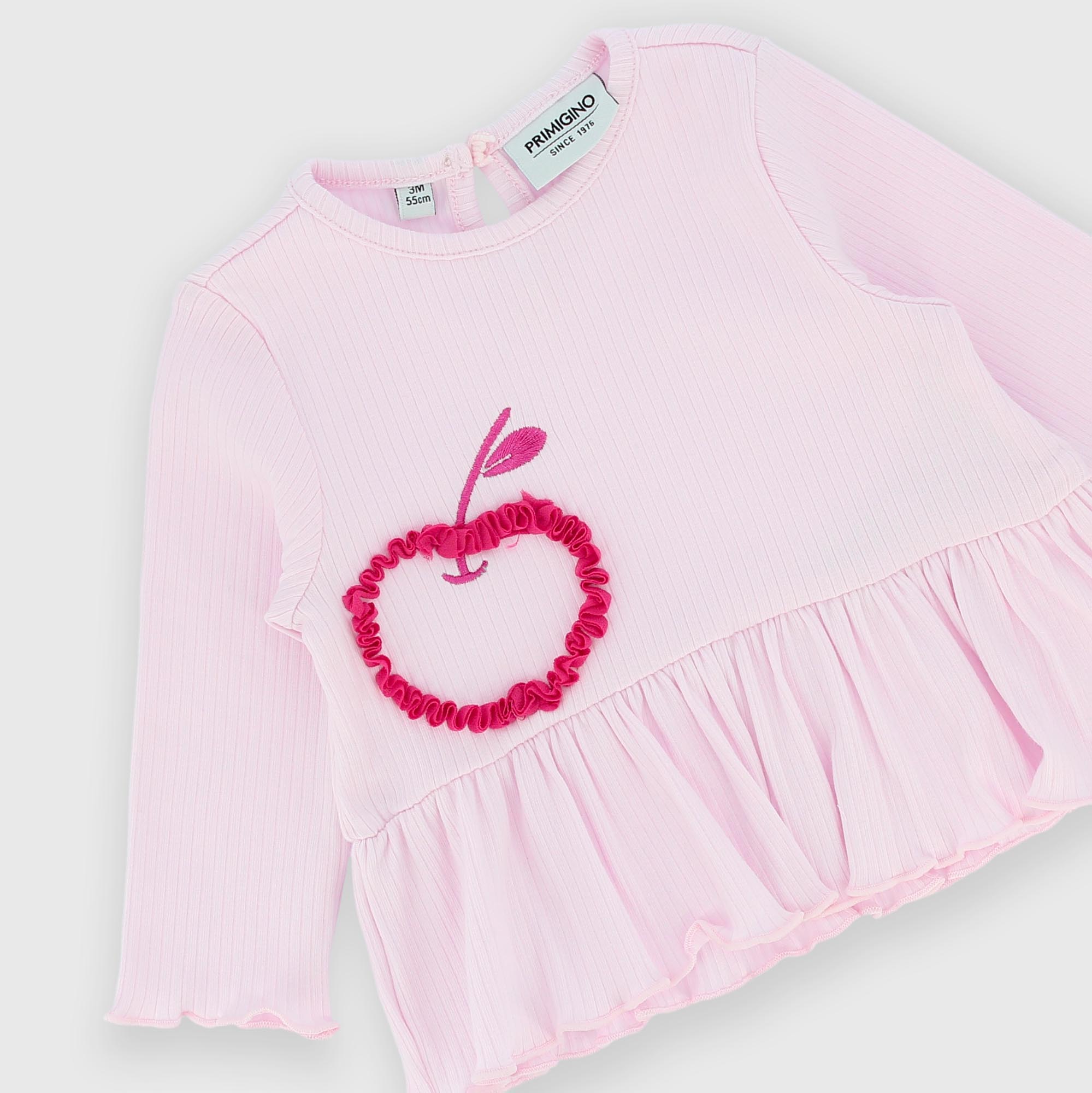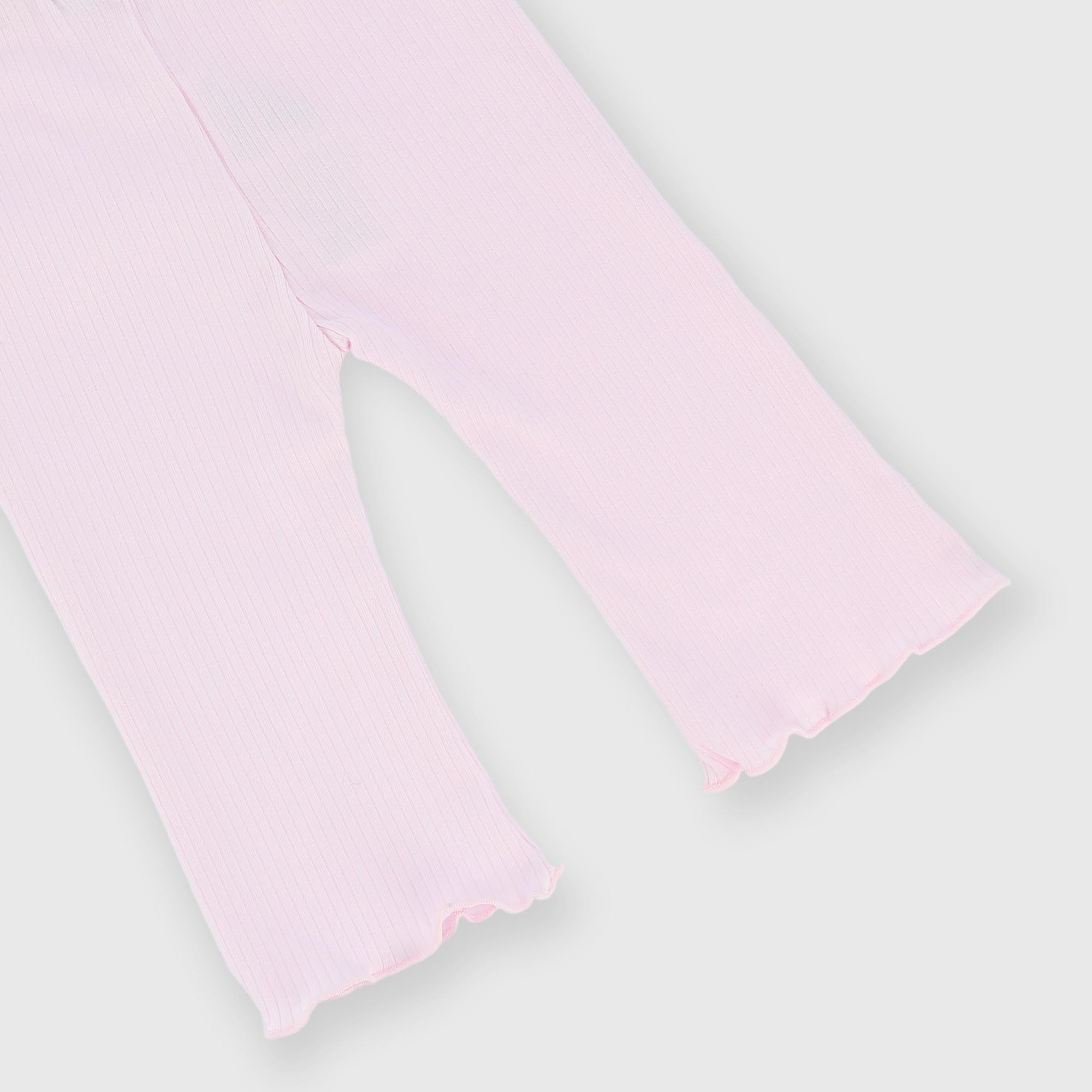 Ribbed suit consisting of two pieces. Jersey T-shirt, crew neck, long sleeves. Closure with button on the back. Organza appliqué on the front. Flounce on the bottom. Ribbed flared trousers with elasticated waistband.