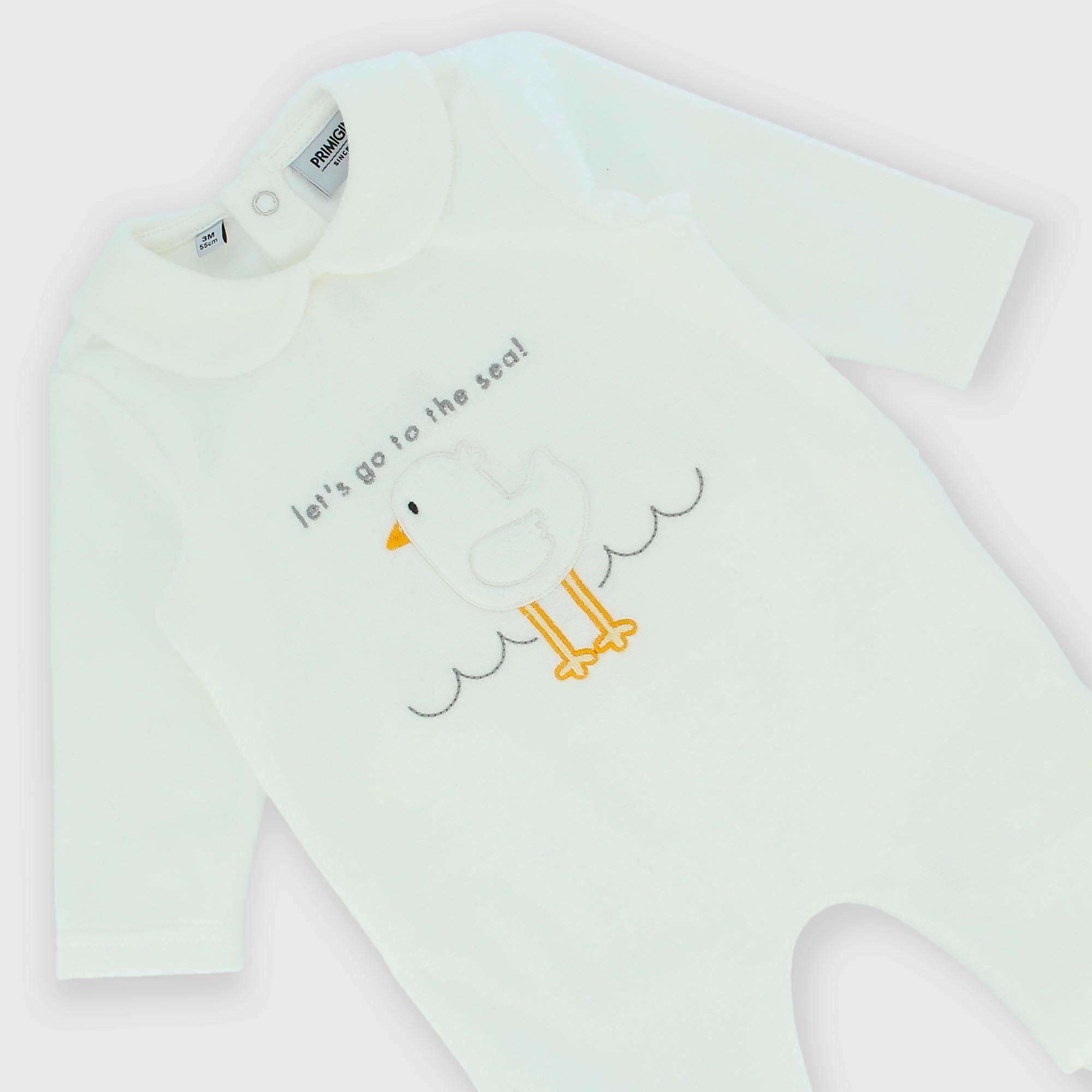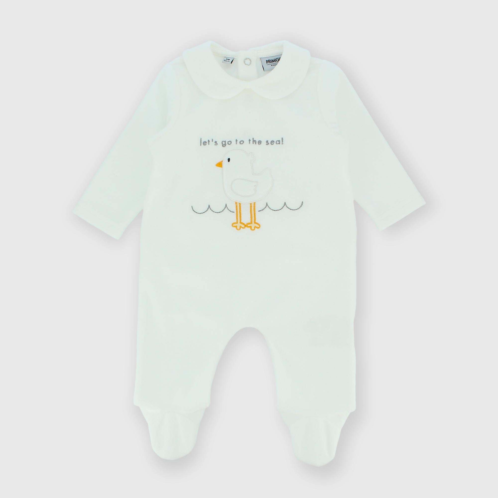 Chenille romper with peter pan collar, long sleeves. Back button closure. Appliqué with embroidery on the front.