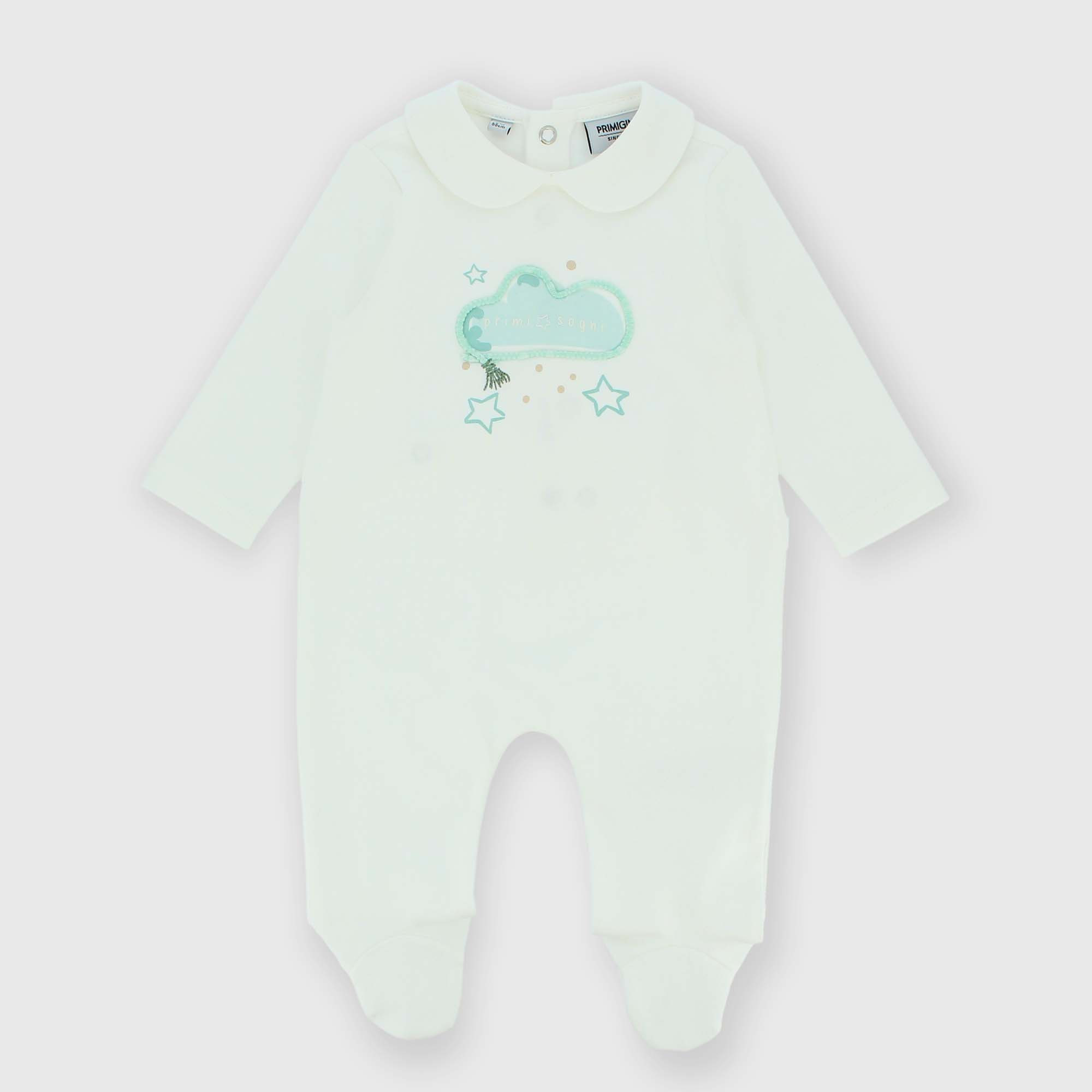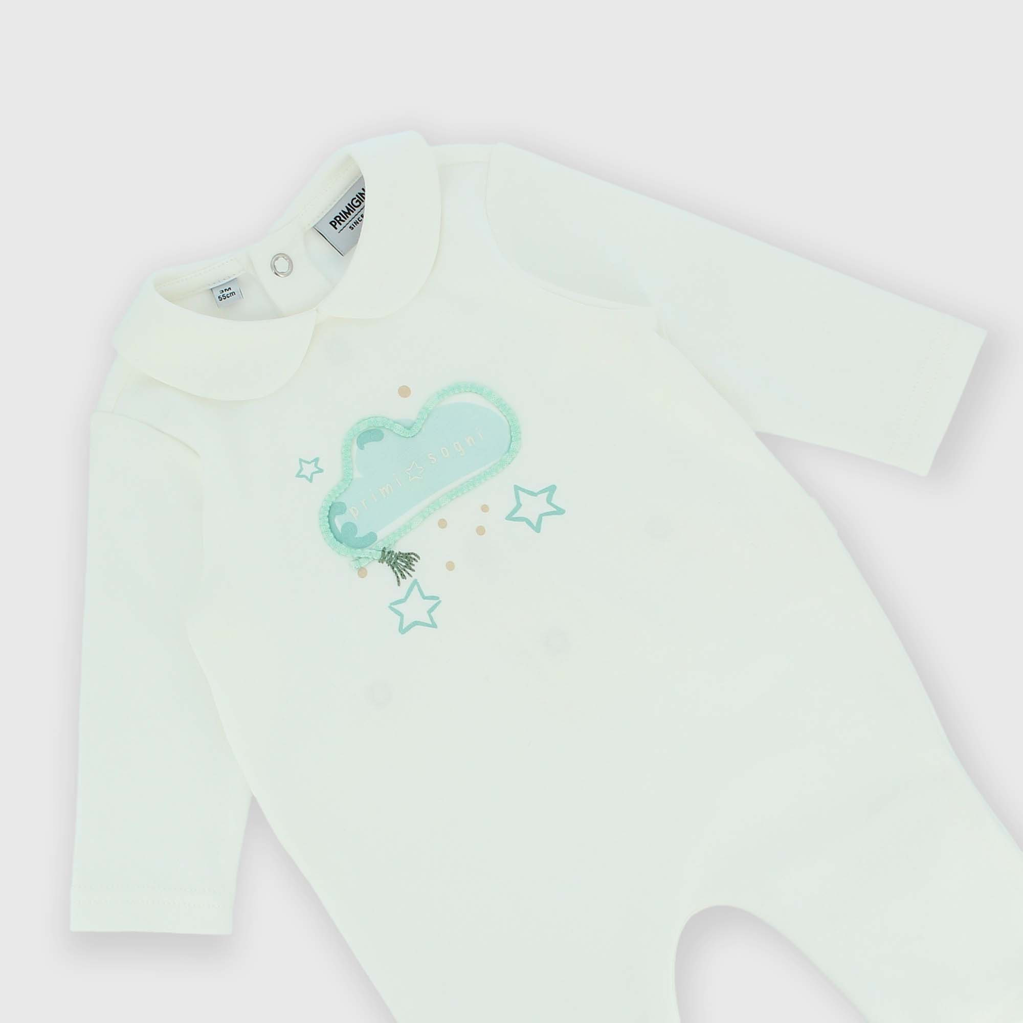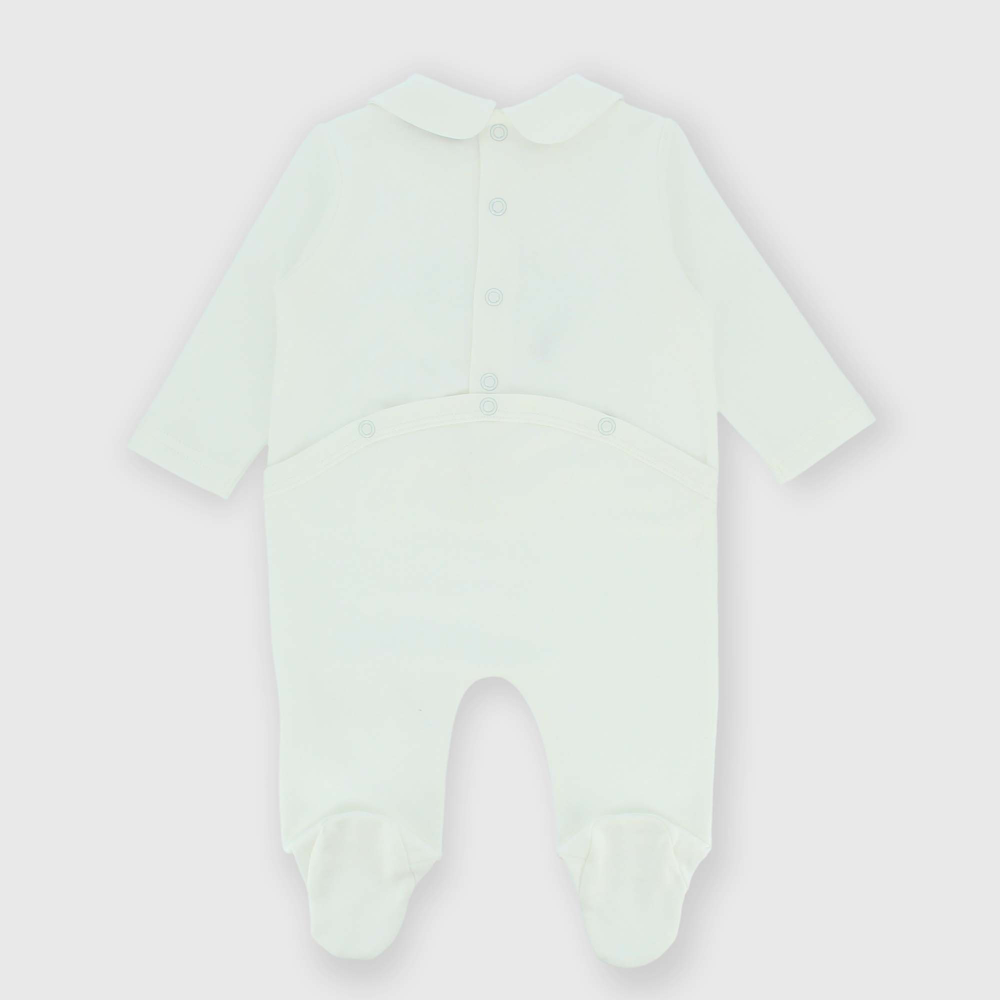 Interlock romper, with peter pan collar, with long sleeves. Back closure with snap buttons. Print and appliqué on the front.