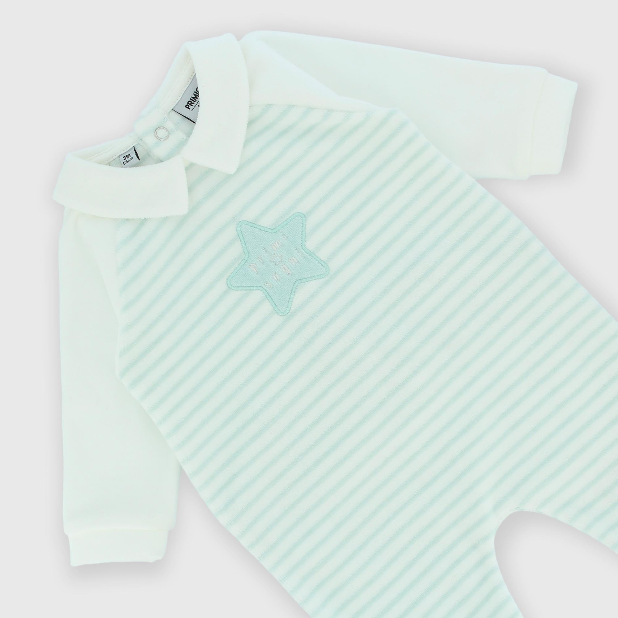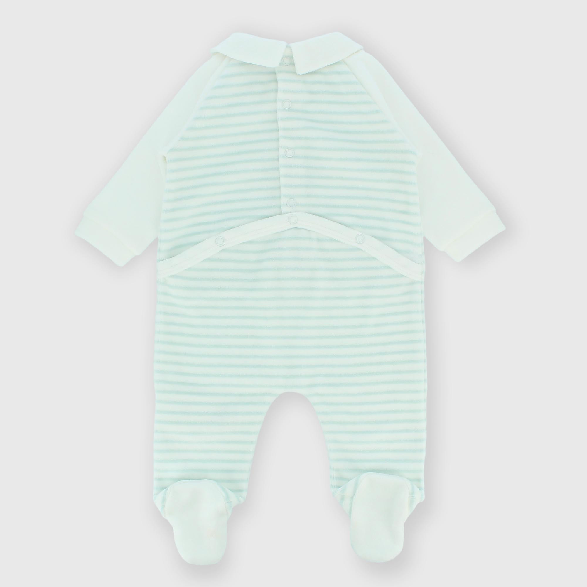 Chenille romper with collar, long sleeves. Back button closure. All-over striped print with embroidered application.