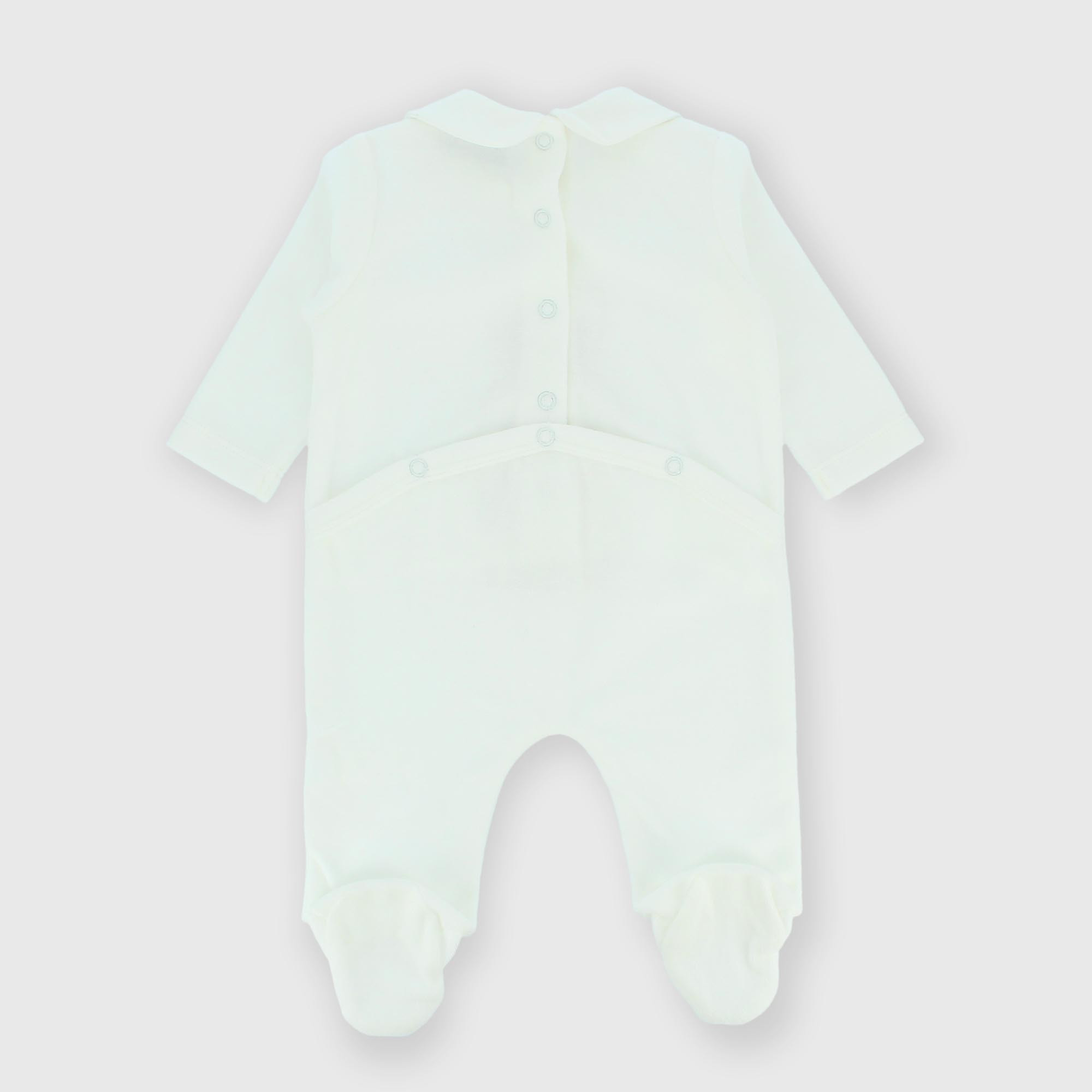 Chenille romper with peter pan collar, long sleeves. Back button closure. Appliqué with embroidery on the front.
