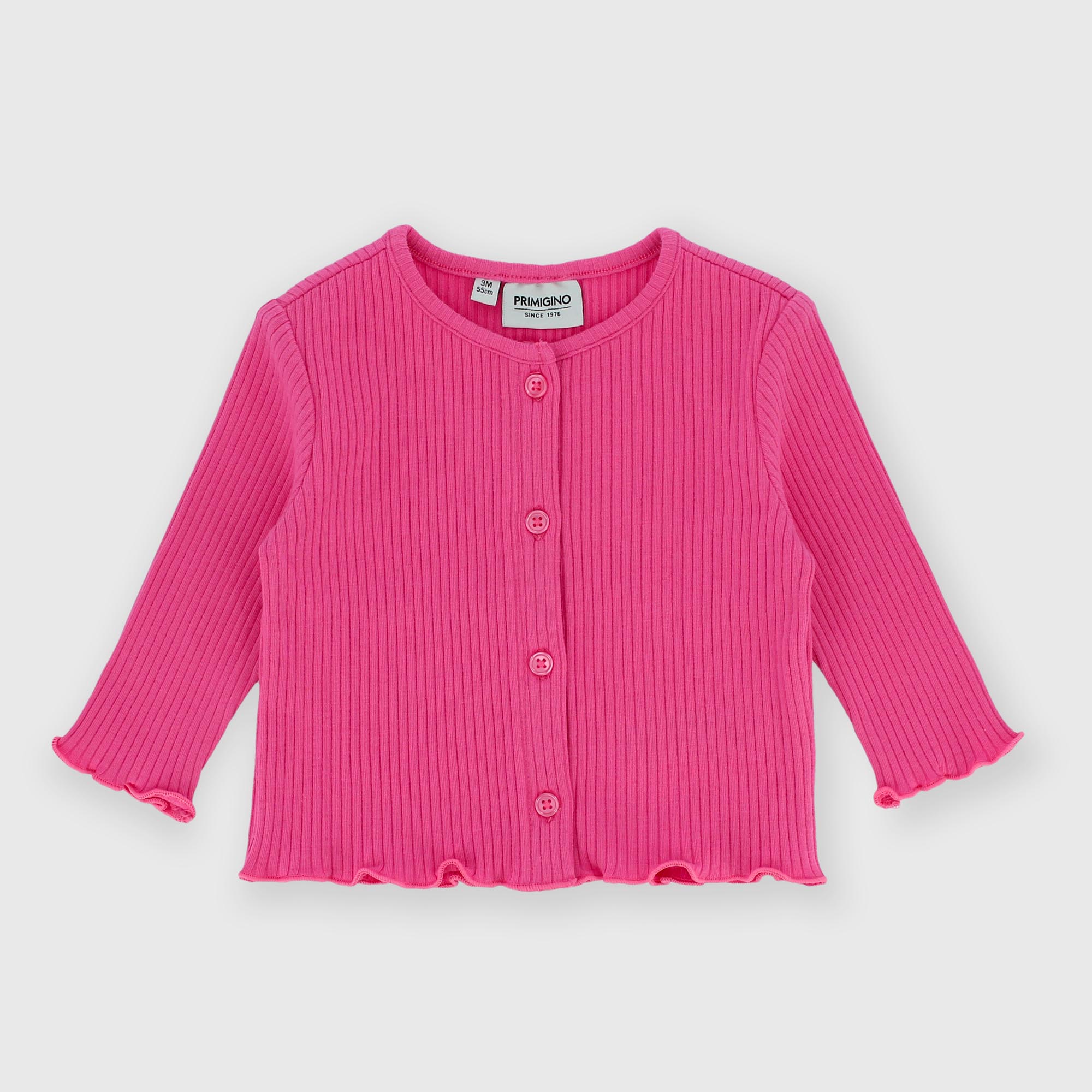 Ribbed Cardigan, crew neck. Button closure on the front. Doll stitch finishes.