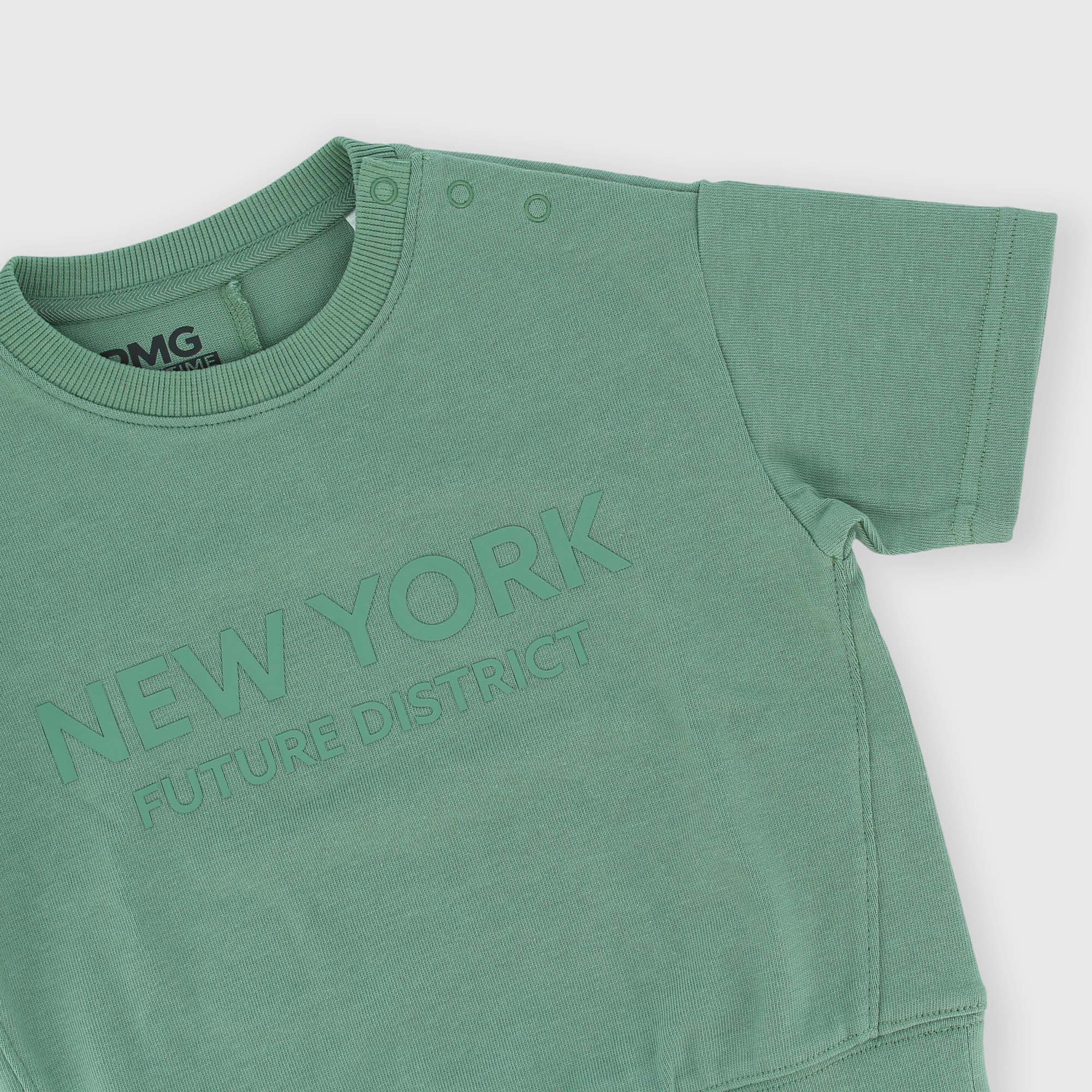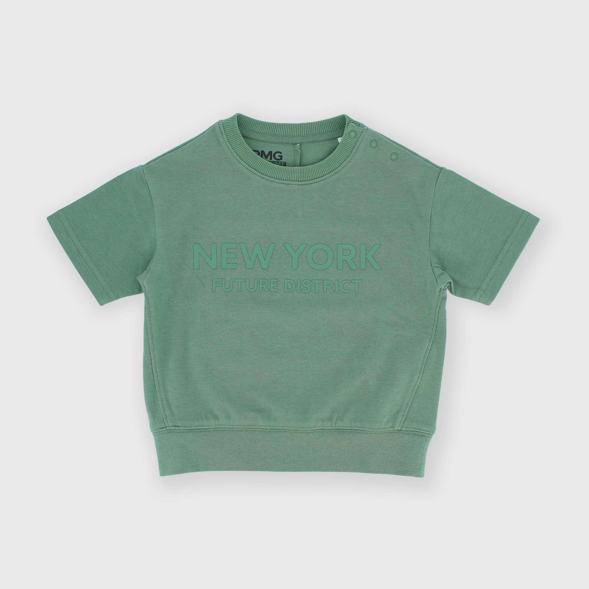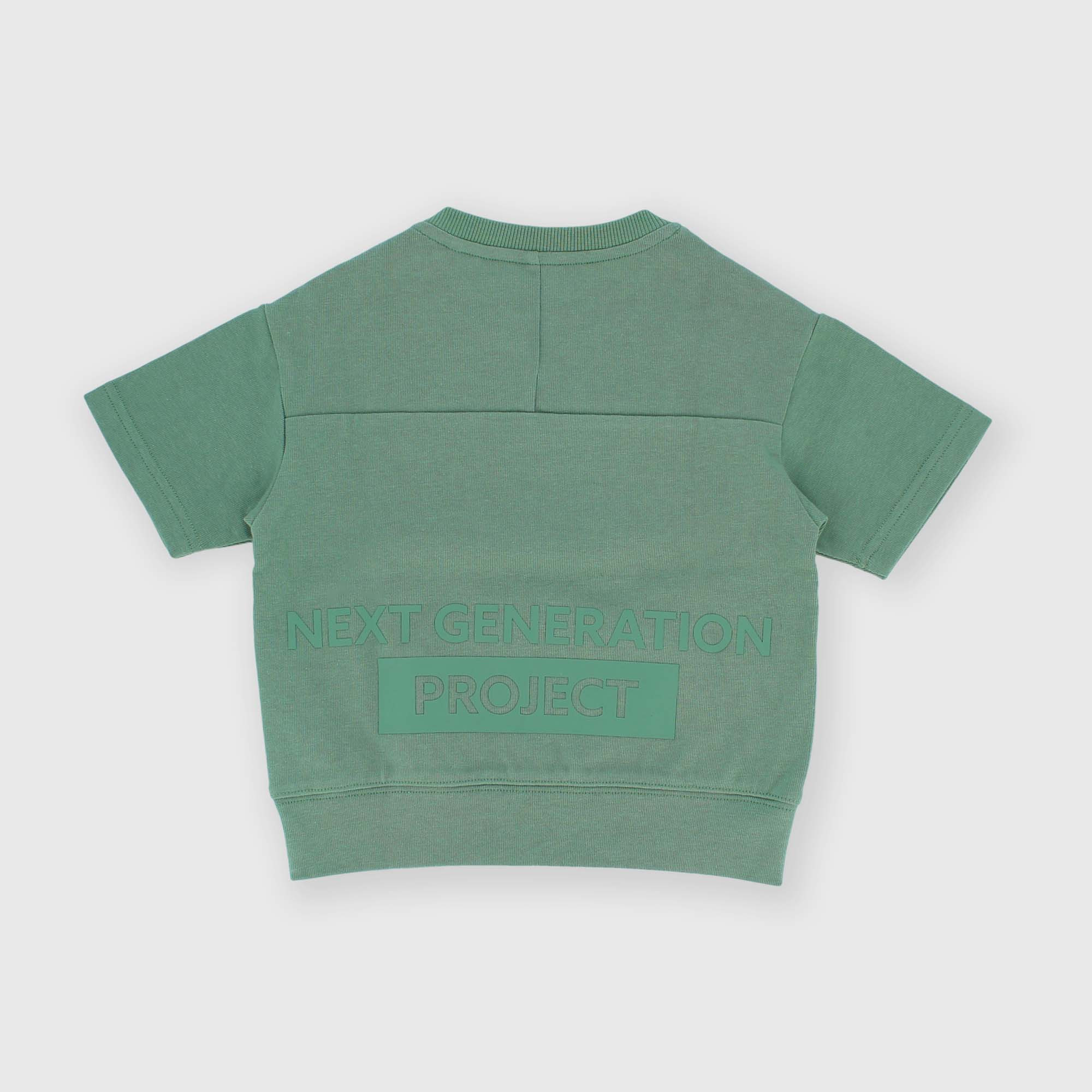 Heavy Jersey T-shirt, crew neck, short sleeves. Snap button closure on the shoulder. Prints with tone-on-tone rubberized-effect lettering on the front and back.