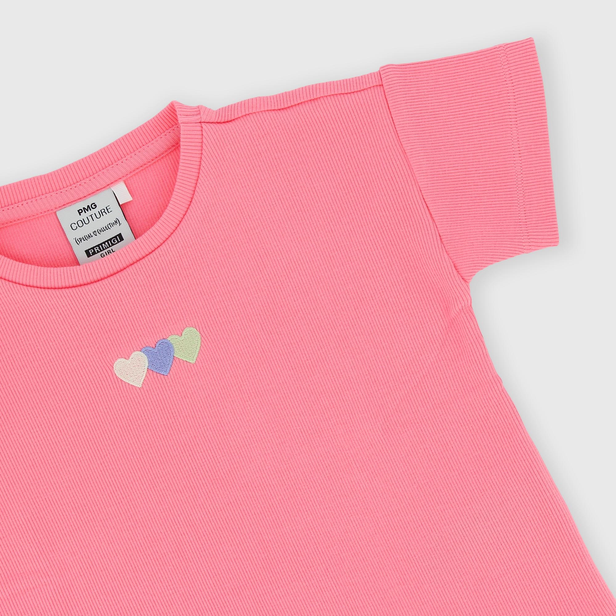 Ribbed T-shirt, crew neck, short sleeves. Hearts embroidered on the front. Doll stitch finishes.
