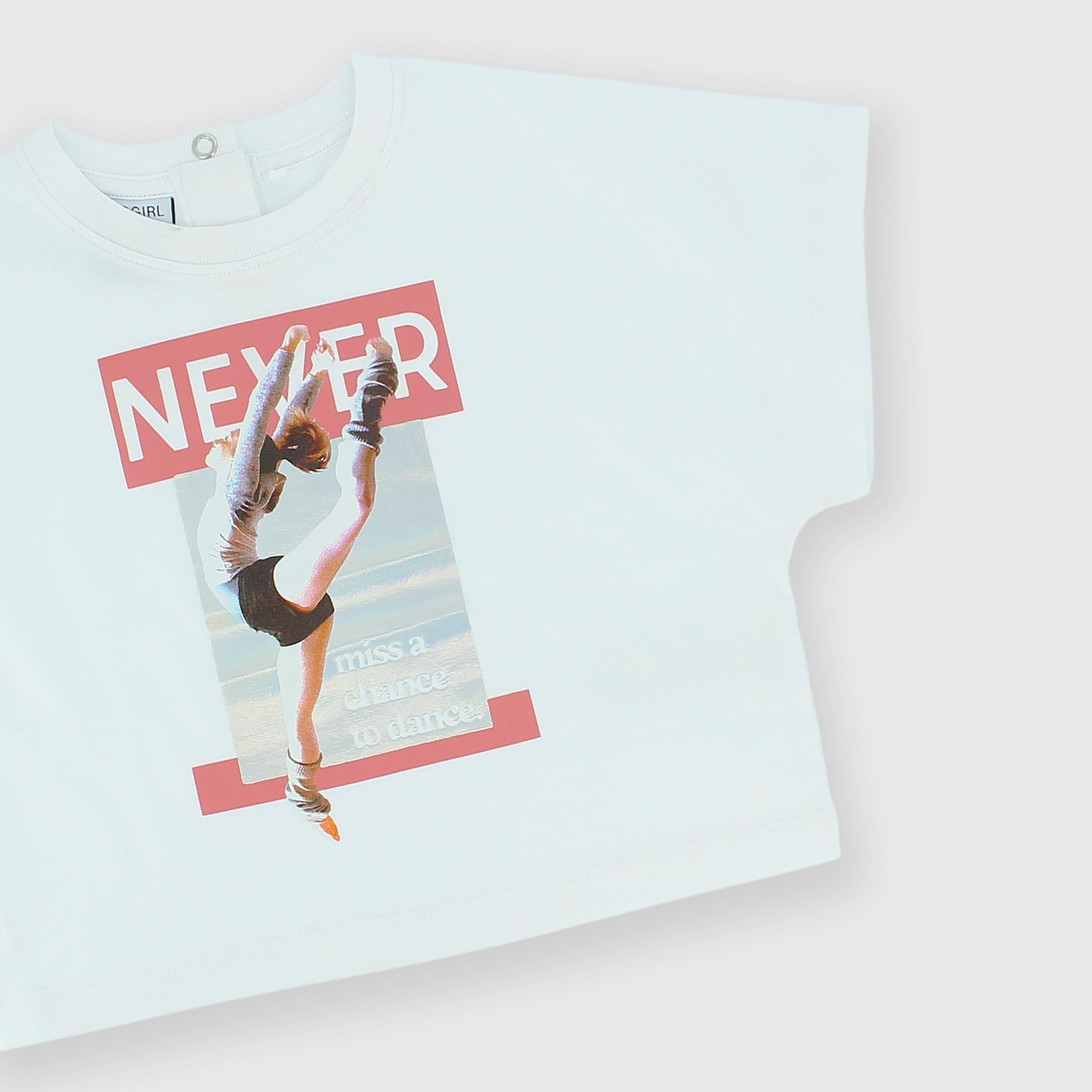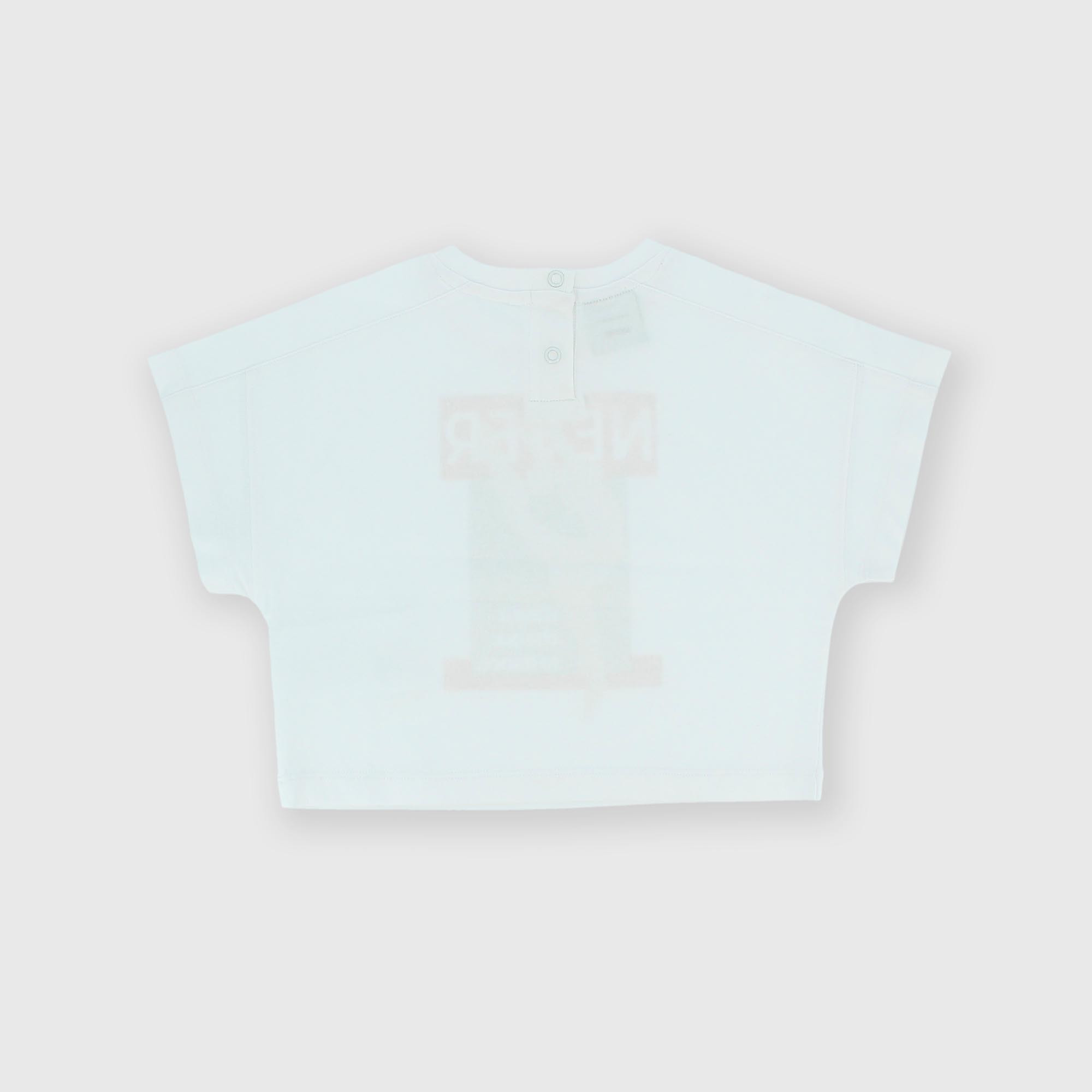 Jersey T-shirt, crew neck, short sleeves. Snap button closure on the back. Photographic print with metallic details.