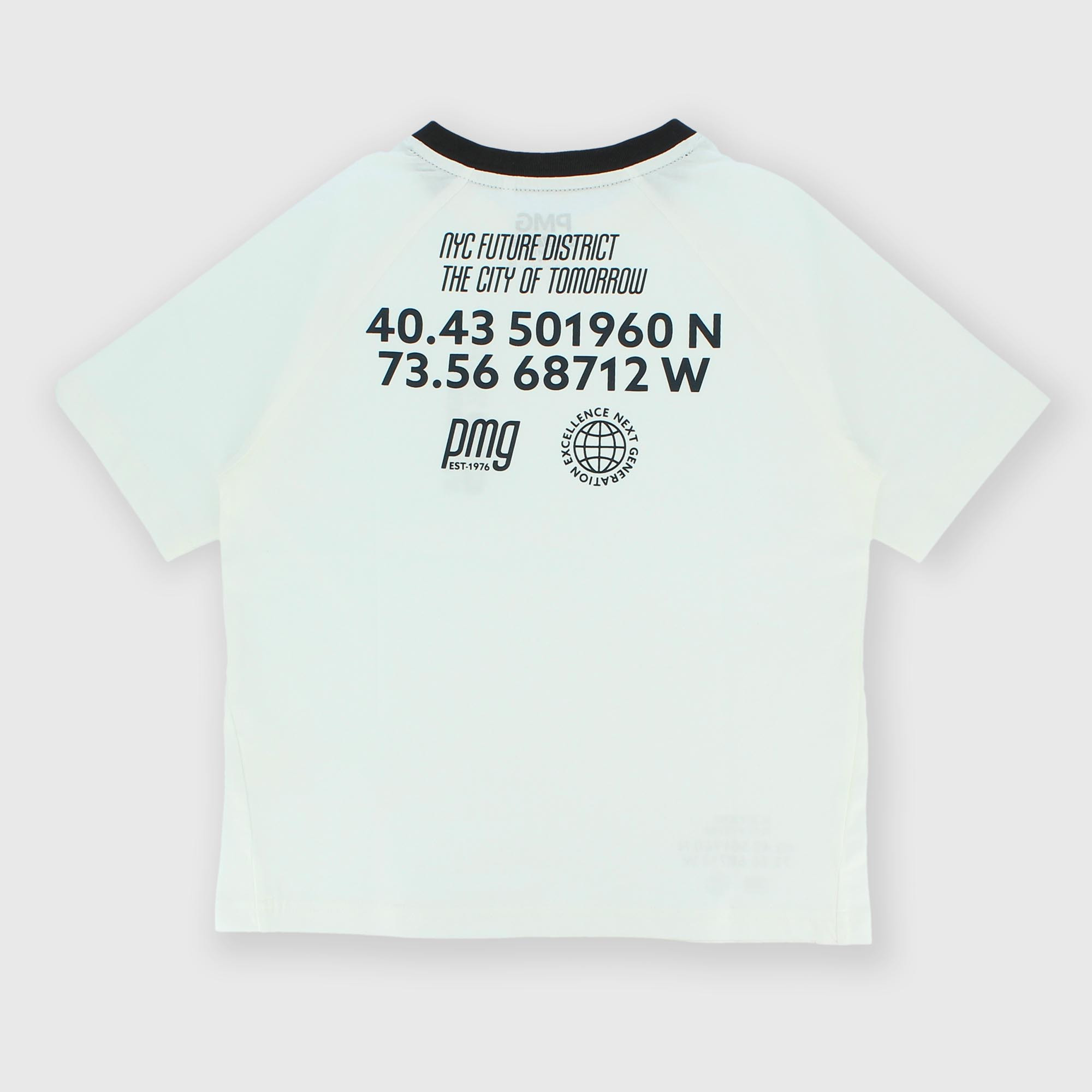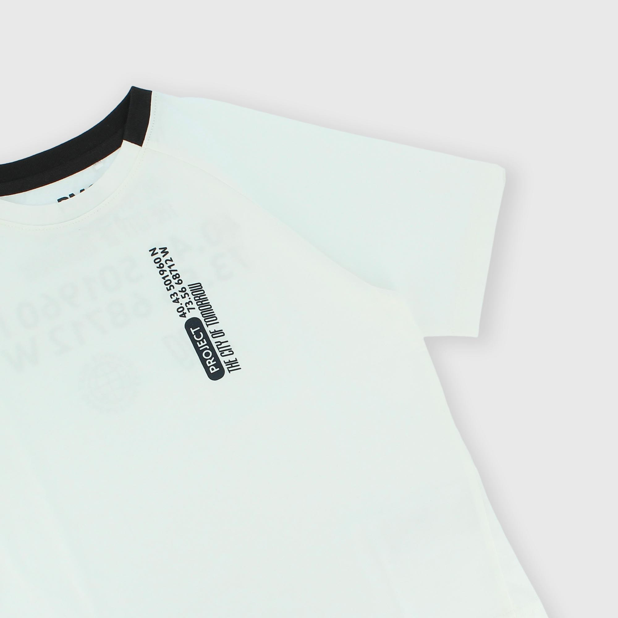 Jersey T-shirt, crew neck, short sleeves. Prints with lettering on the front and back. Contrasting ribbed collar.