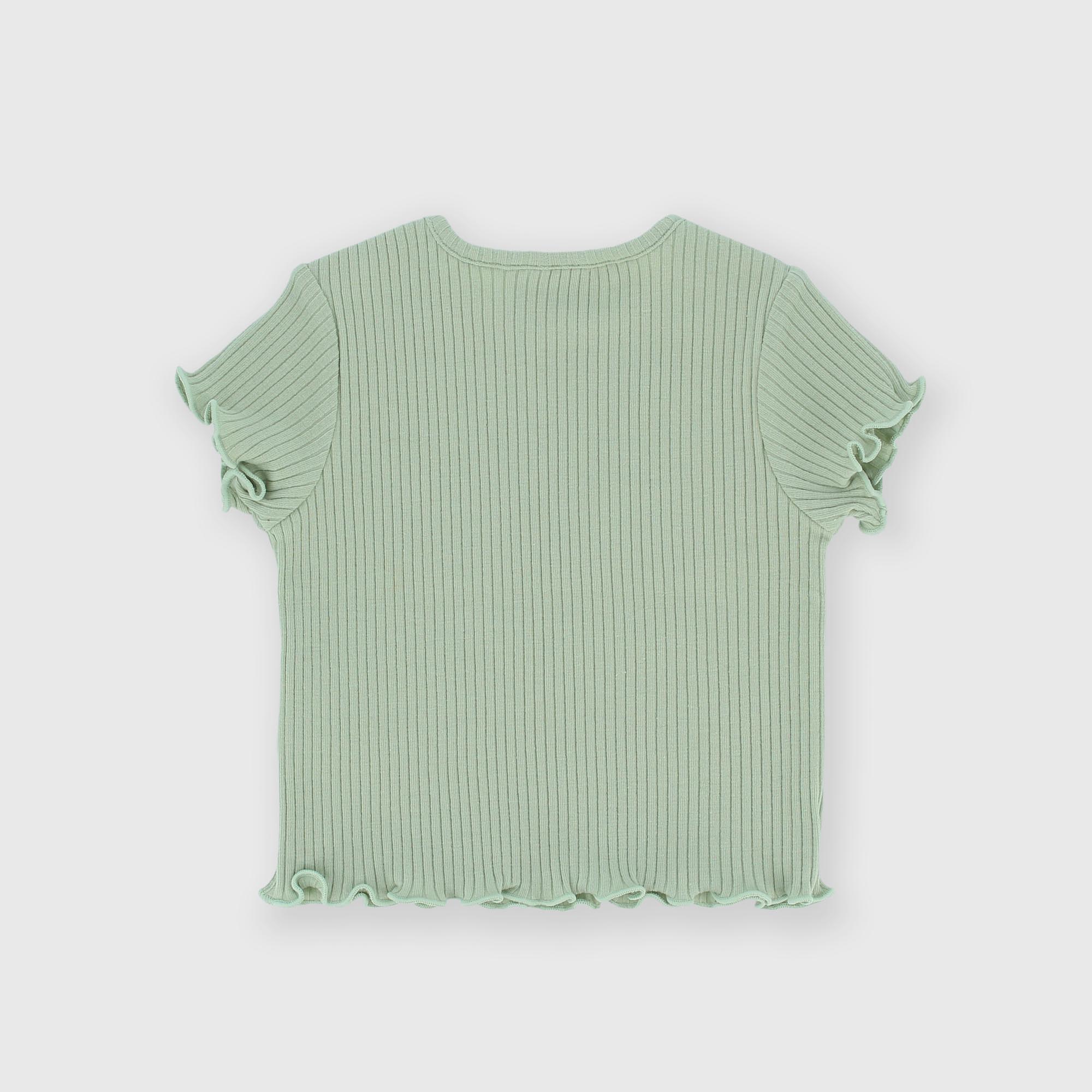 Ribbed T-shirt, crew neck, with short sleeves. Snap button closure on the shoulder. Doll stitch finishes.