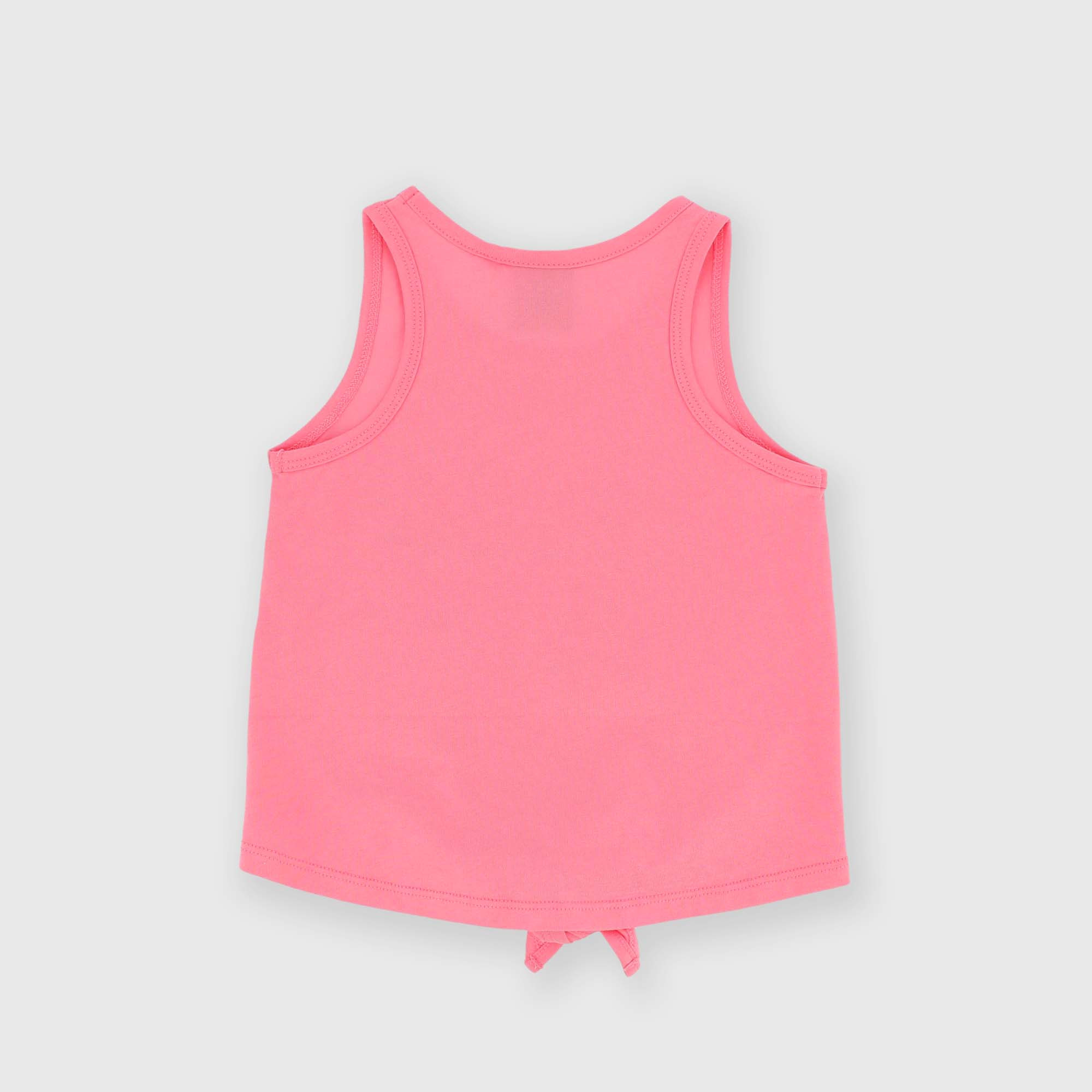 Jersey tank top, crew neck. Sequin-effect print on the front. Knot on the bottom.