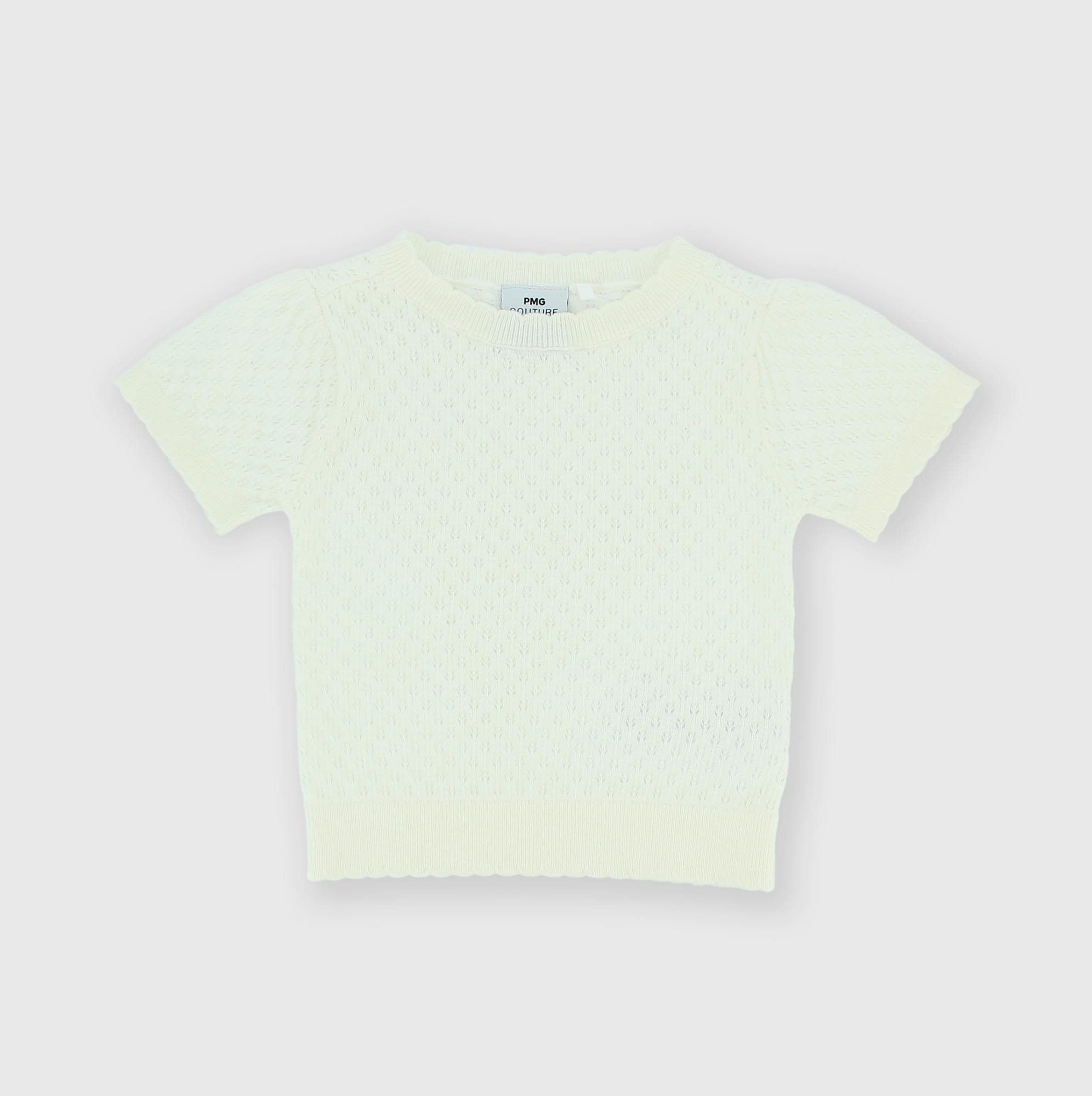 Tricot sweater in soft cotton, crew neck, short sleeves. Perforated effect workmanship.