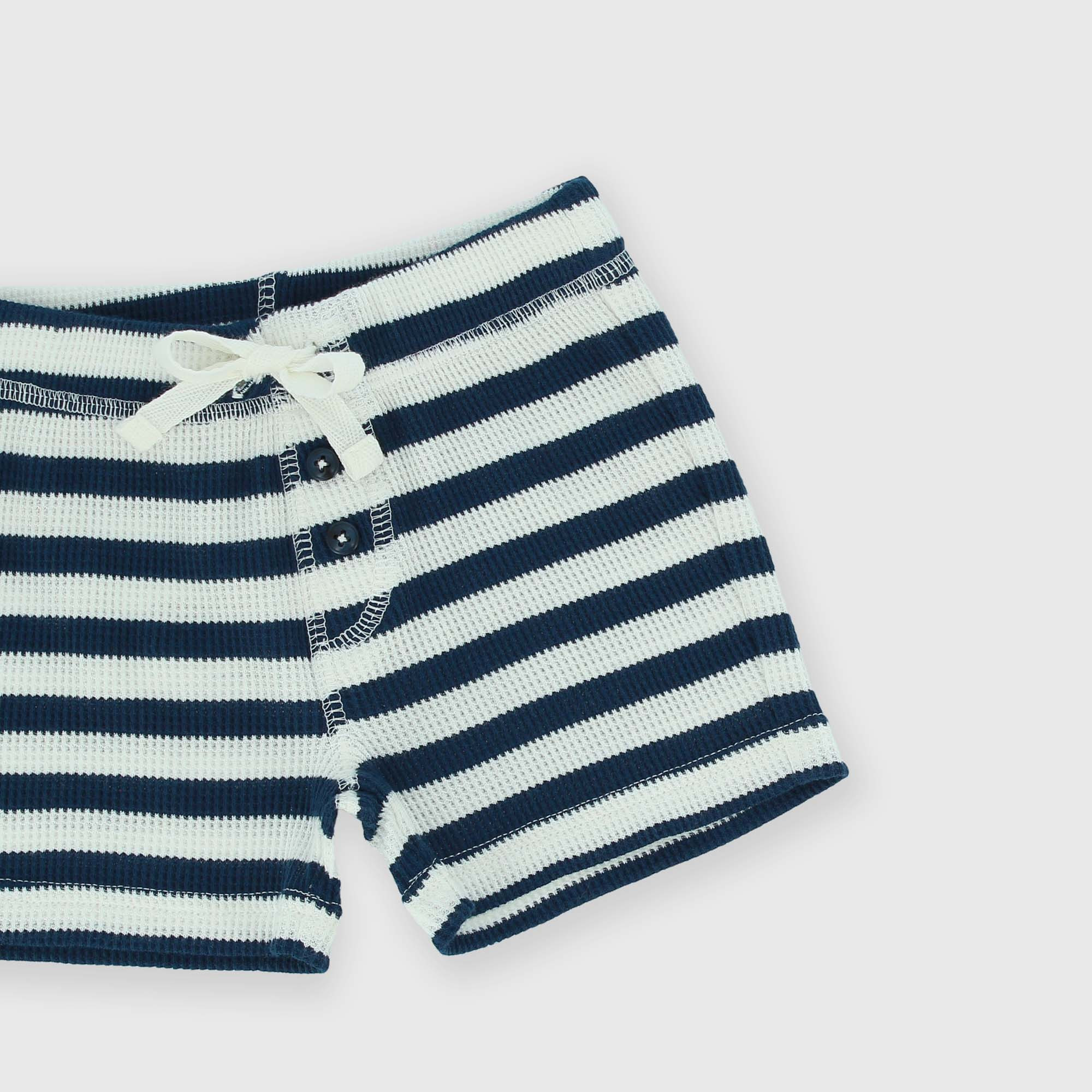 Yarn-dyed striped Jersey Bermuda shorts with elasticated waistband and front laces. Buttons applied. Honeycomb processing.