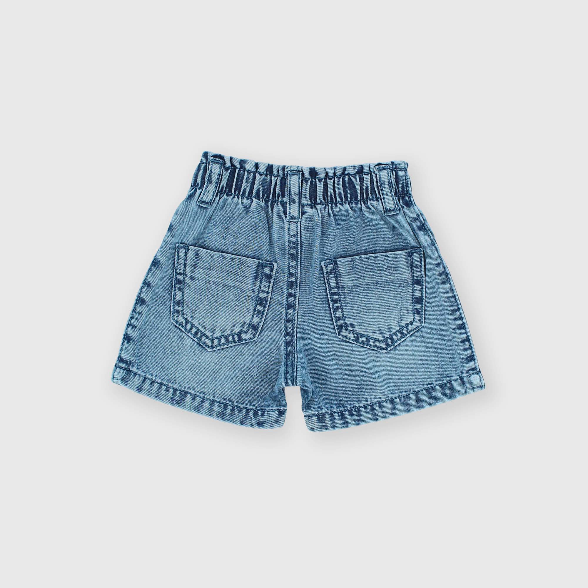 Denim shorts with elasticated waistband. Snap button closure. Patch pockets on the back.