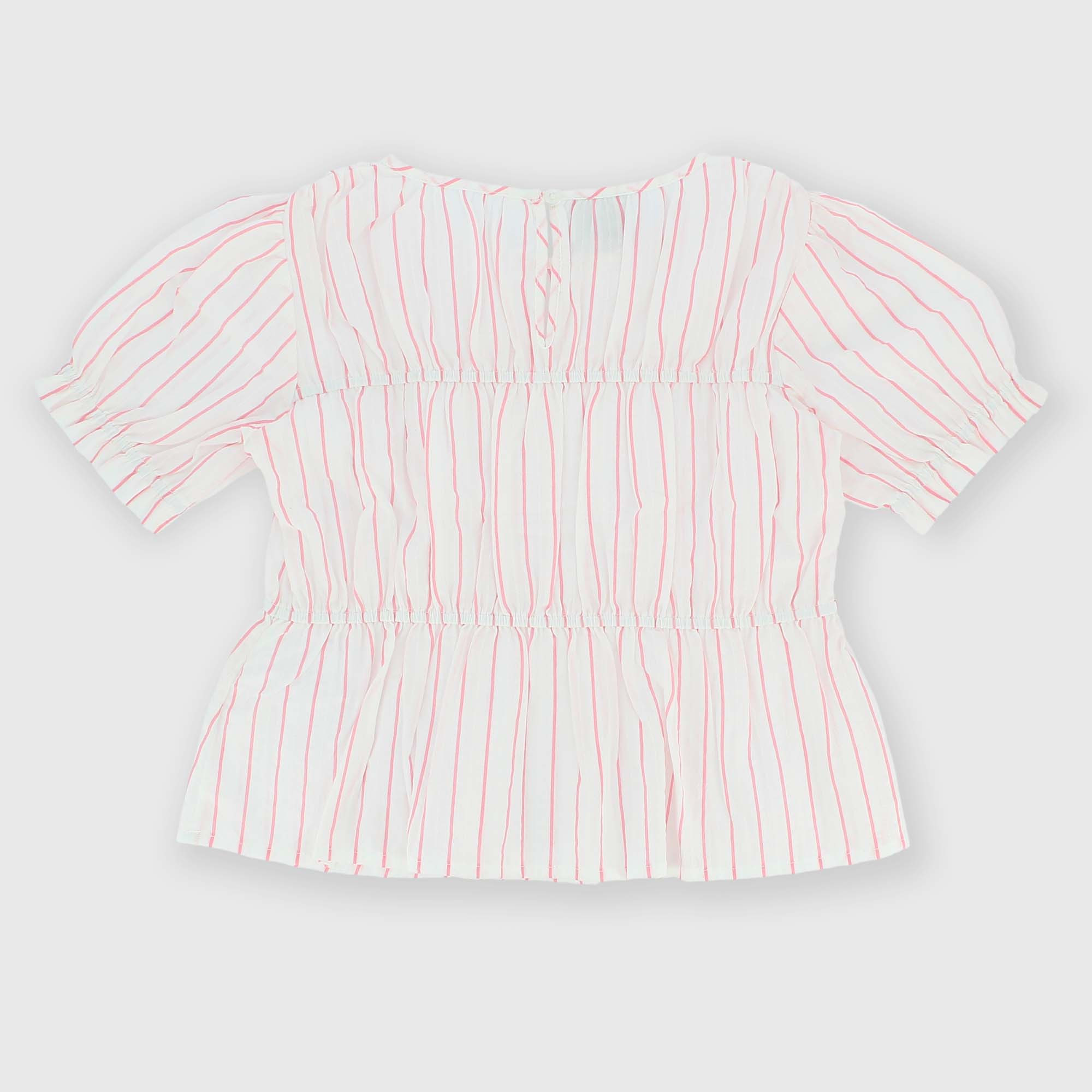 Yarn-dyed striped cotton top, crew neck, with short balloon sleeves. Closure with button on the back. Elastic stitching.