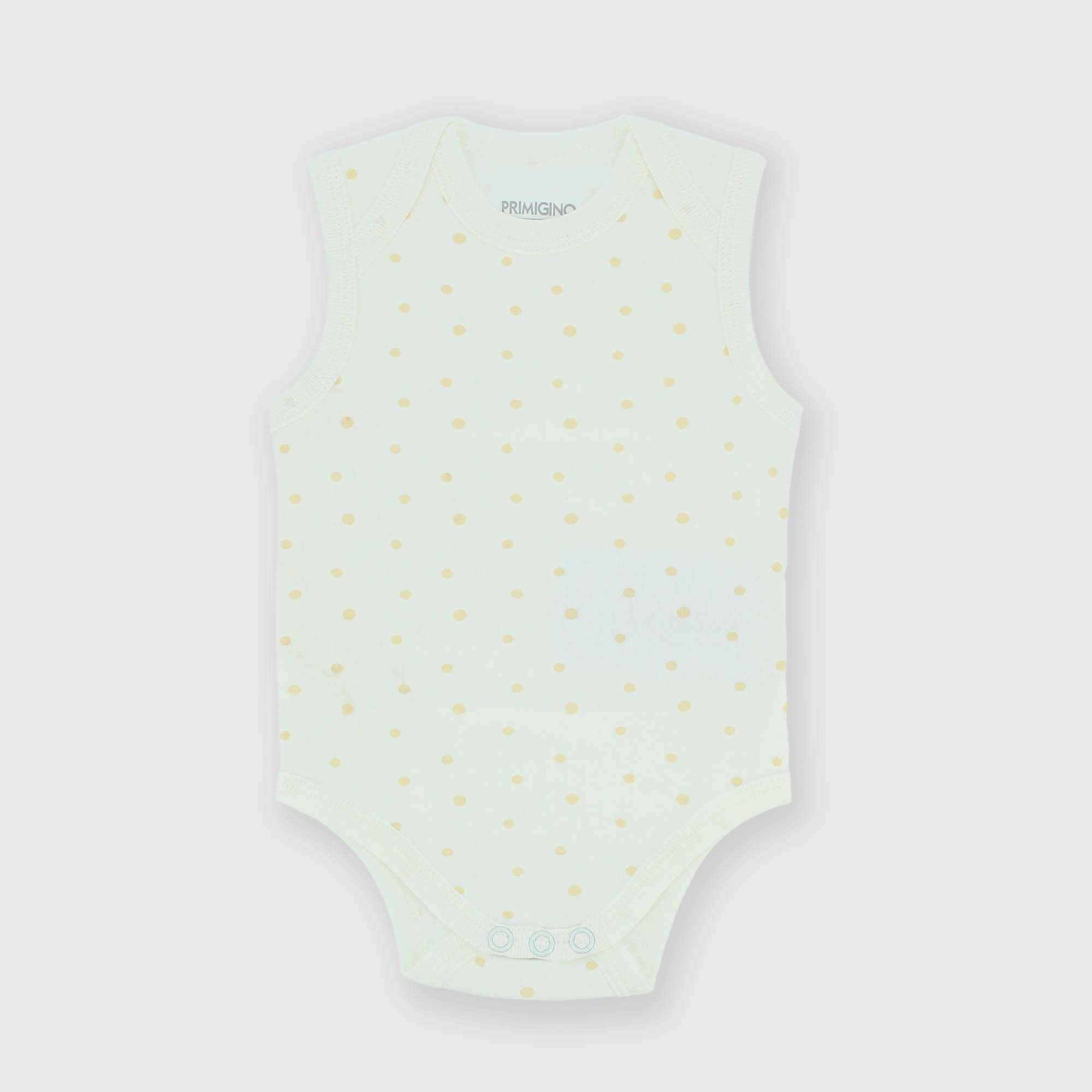Interlock bodysuit crew neck, armholes. Snap button closure on the bottom. All-over polka dot print.