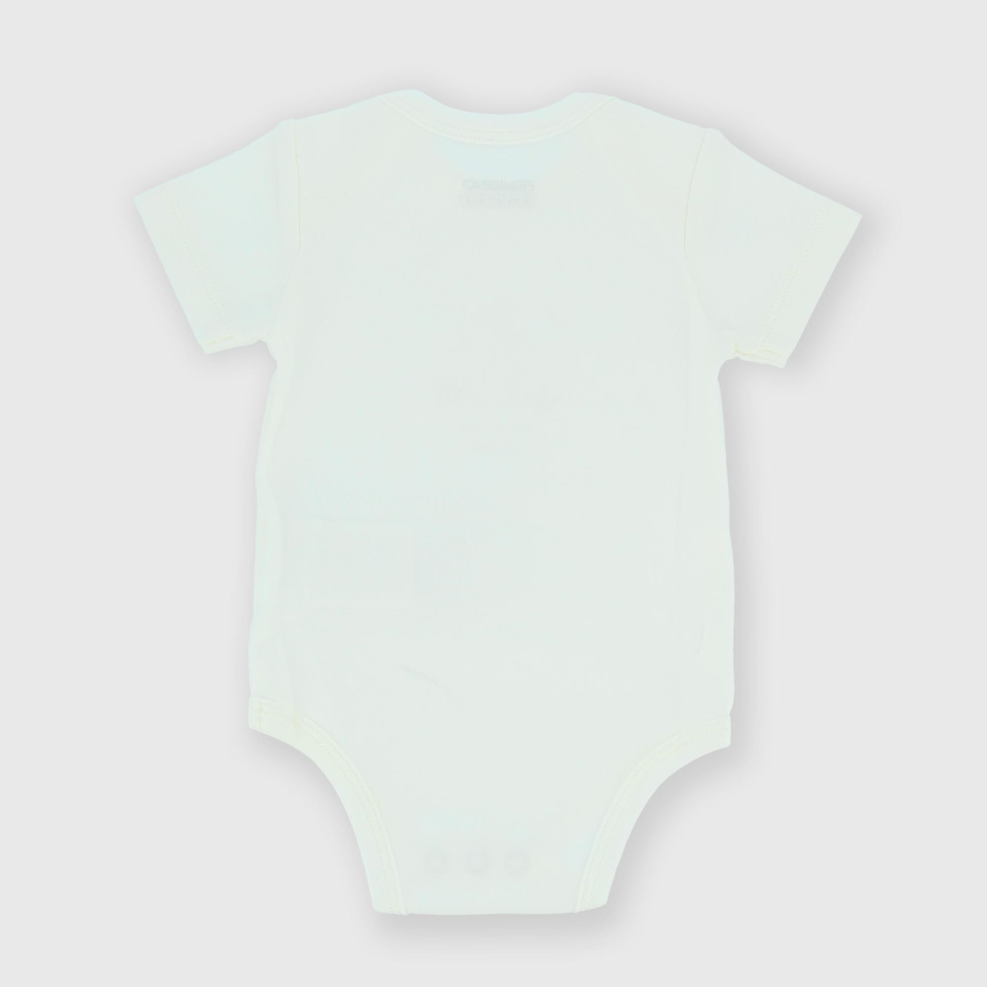 Ribbed bodysuit with crew neck, short sleeves. Snap button closure on the bottom. Printing on the front.