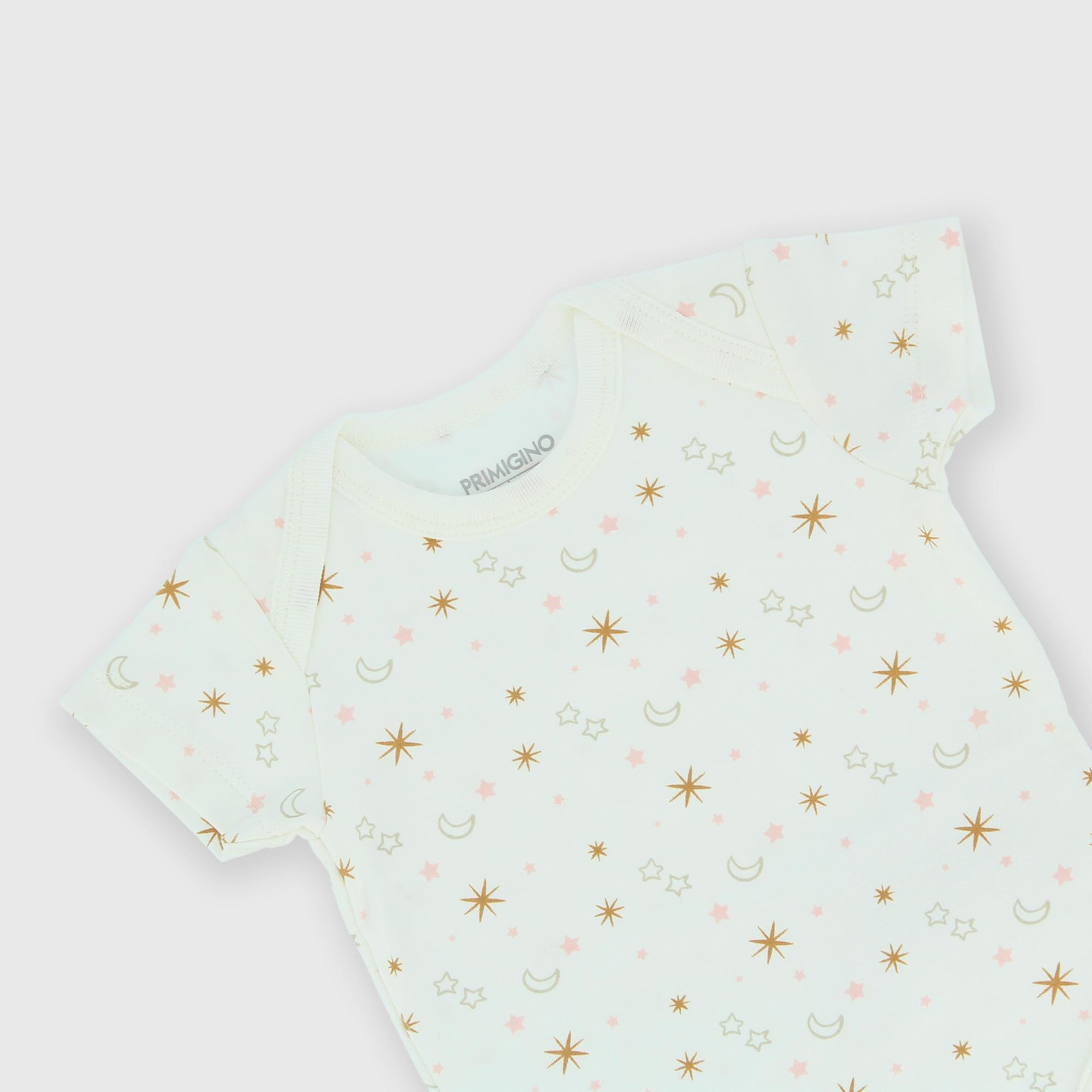 Ribbed bodysuit with crew neck, short sleeves. Snap button closure on the bottom. All-over printing.