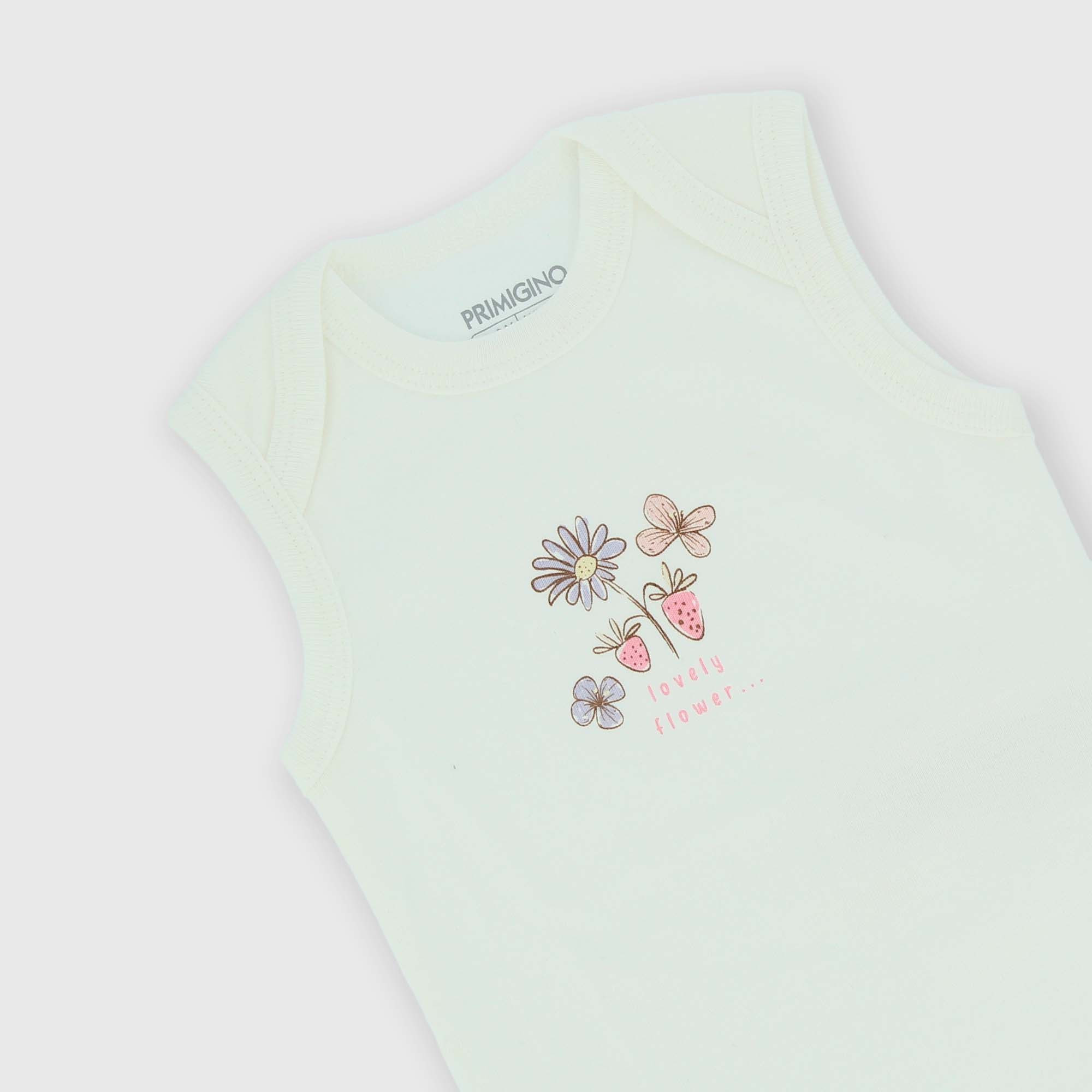 Ribbed bodysuit with crew neck, armholes. Snap button closure on the bottom. Flower print on the front.