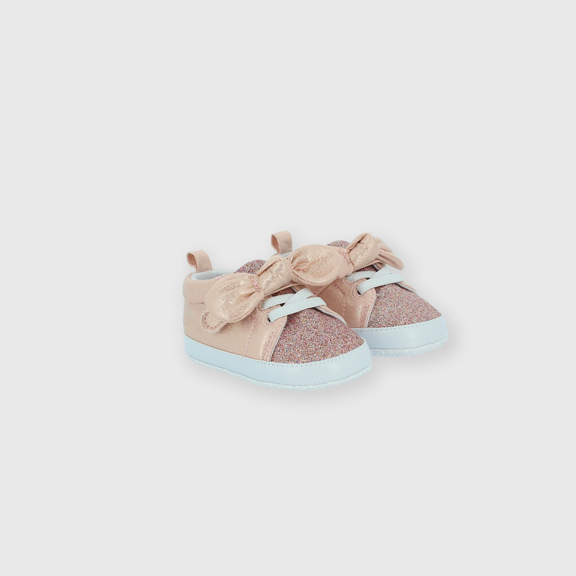 Sneakers for newborns with elastic laces. Lurex fabric with glitter. Applied bows.