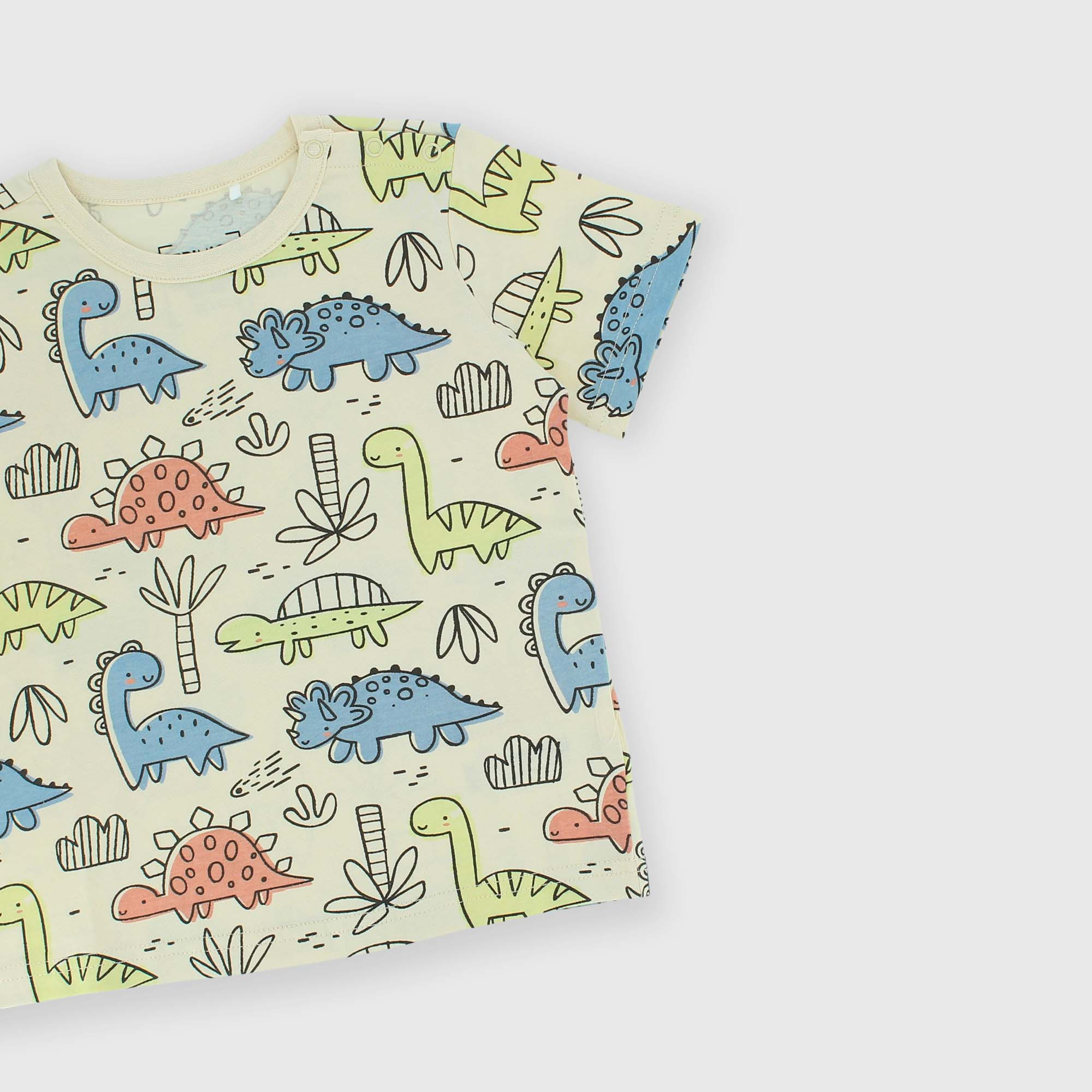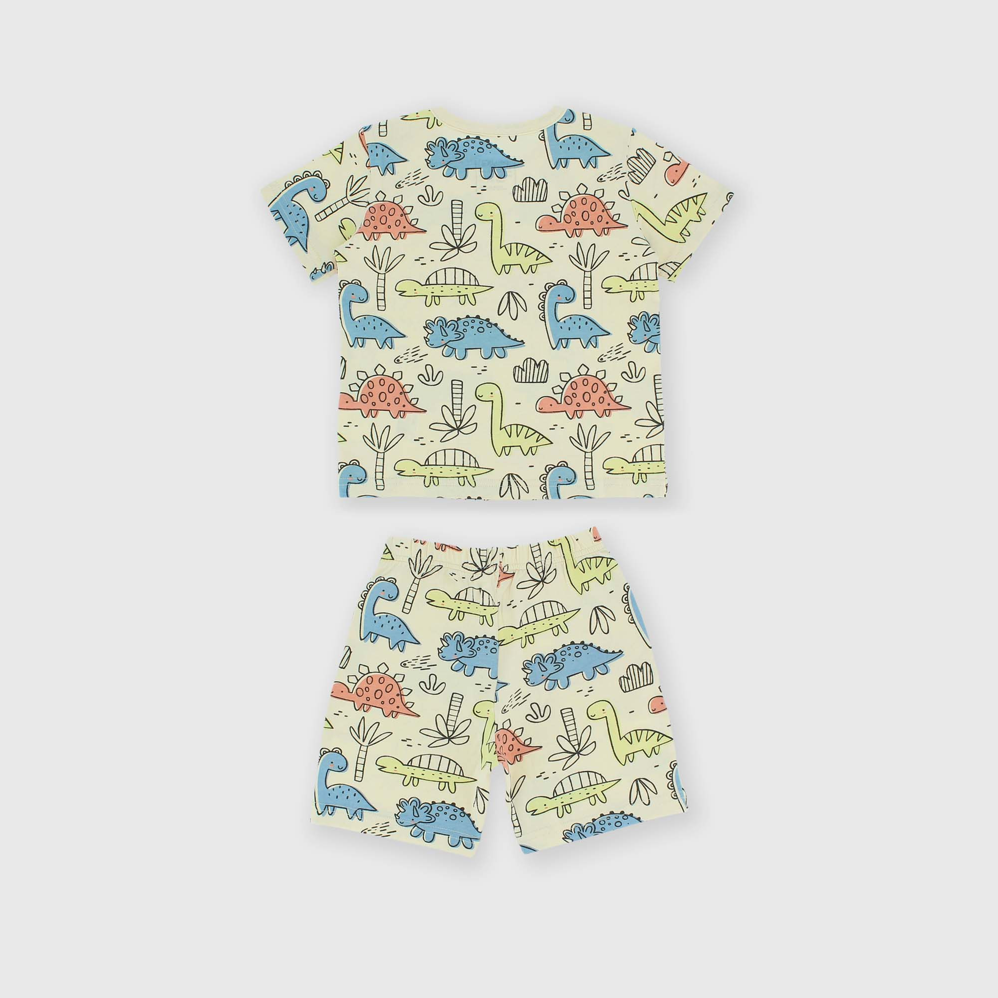 Jersey pyjama set with all-over dinosaur print. Short-sleeved crewneck T-shirt, snap button closure on the shoulder. Bermuda shorts with elasticated waistband.