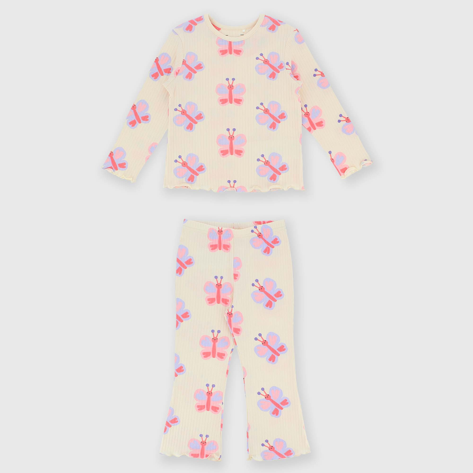 Ribbed pyjama set with all-over heart print. Long-sleeved crewneck T-shirt. Trousers with elasticated waistband. Doll stitch finishes.