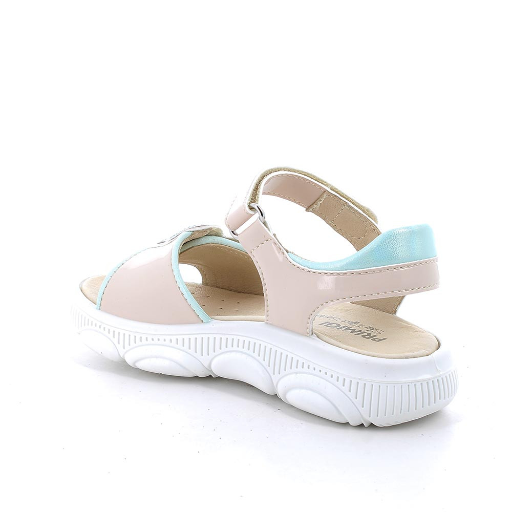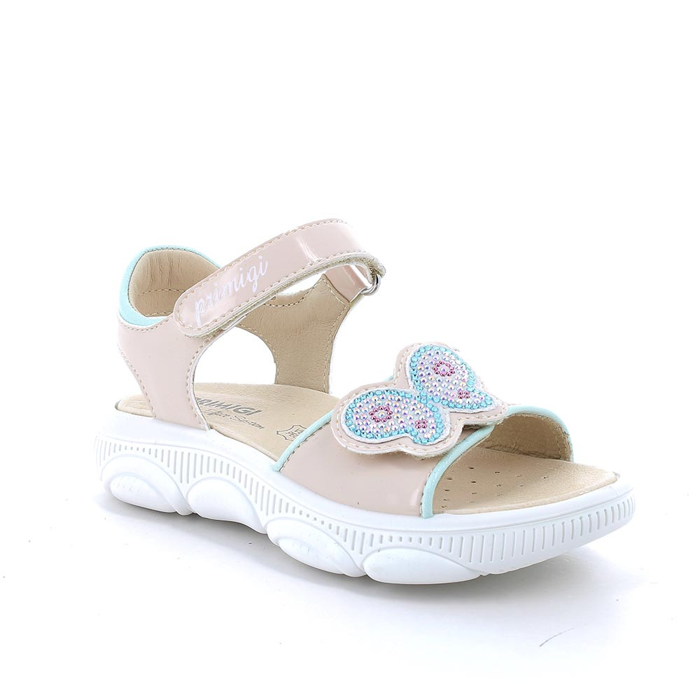 Sandals for girls characterized by a delicate and colorful design. The adjustable front band is embellished with colored rhinestones that add sparkle. The closure is with velcro. The ankle is protected by a small padding. These sandals have a thick sole that features a rounded bubble structure which ensures comfort and cushioning while walking. Both the lining and the leather insole ensure hygiene and breathability.