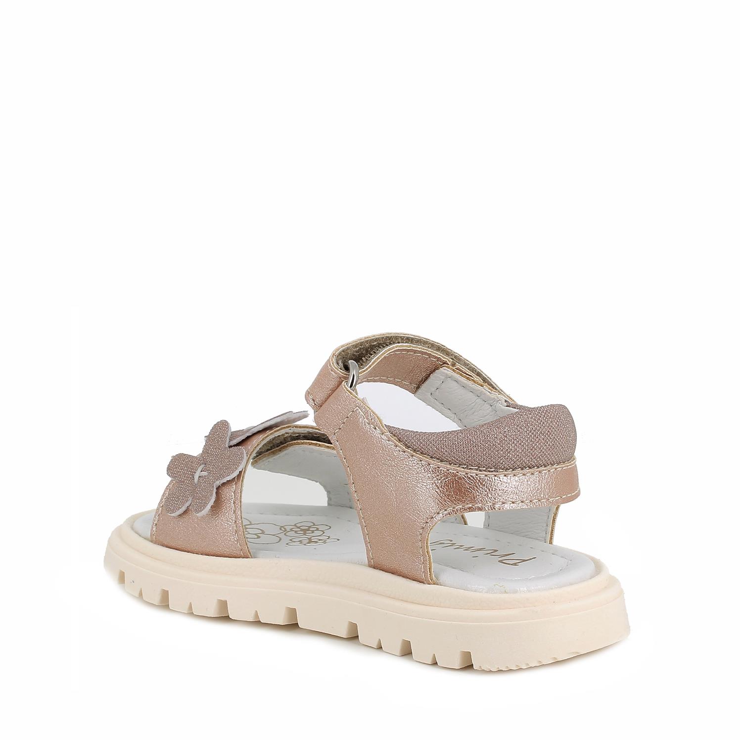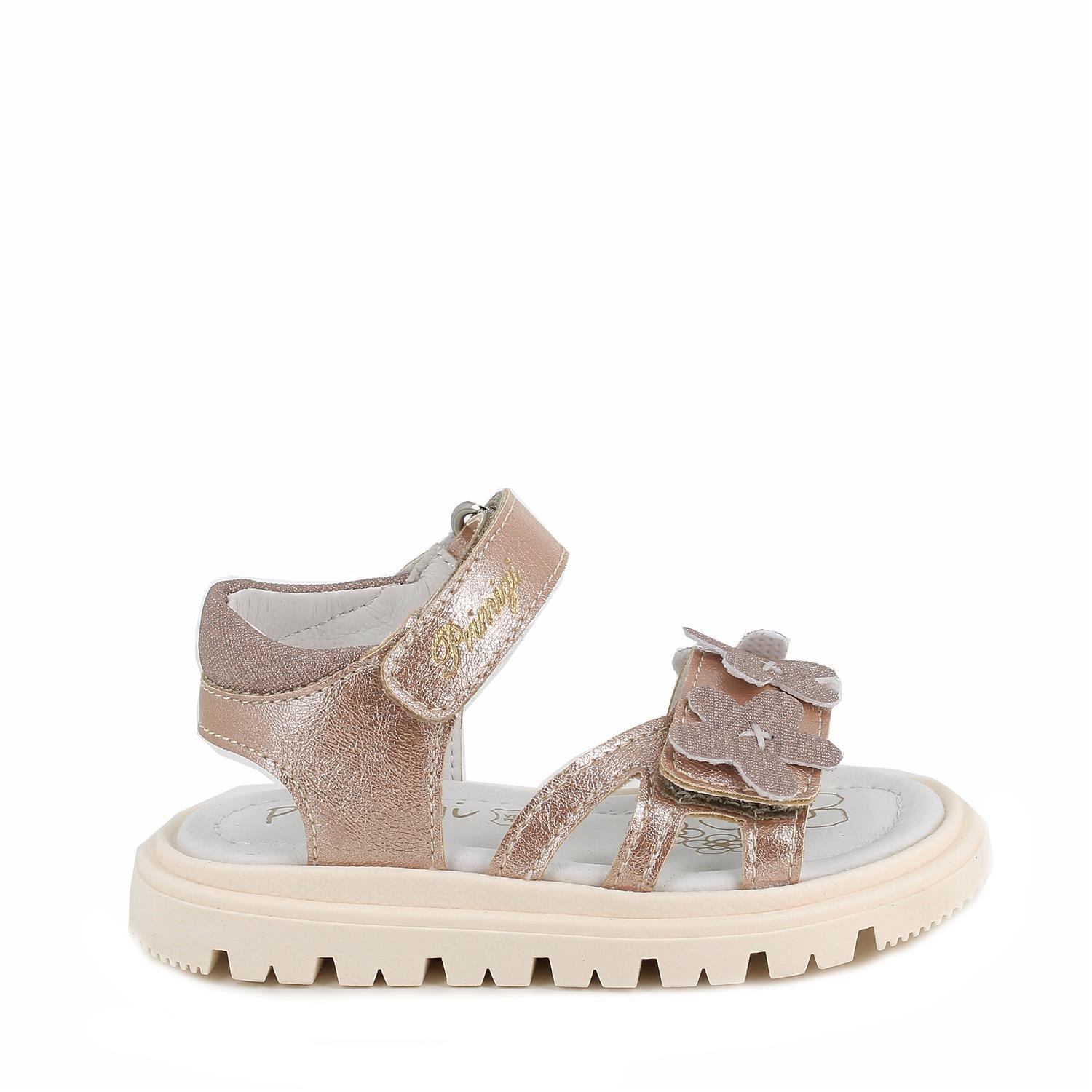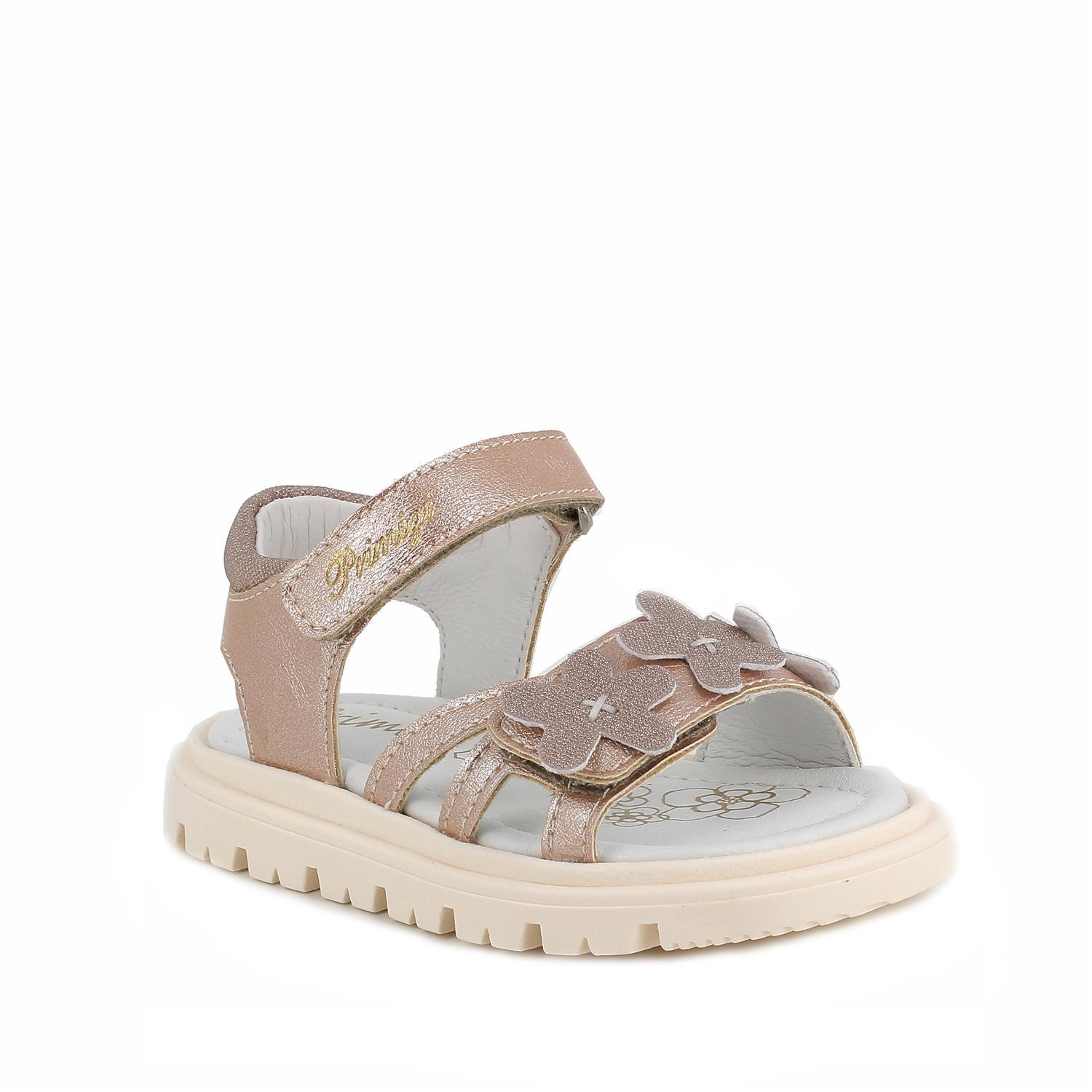 Delightful little girl's first steps sandals with crossed straps and little flowers applied. The back is open and small padding is inserted at the ankle. Also adjustable at the front, they are perfect for first adventures. The non-slip sole is durable and very flexible. The foot rests on a delicate leather insole.