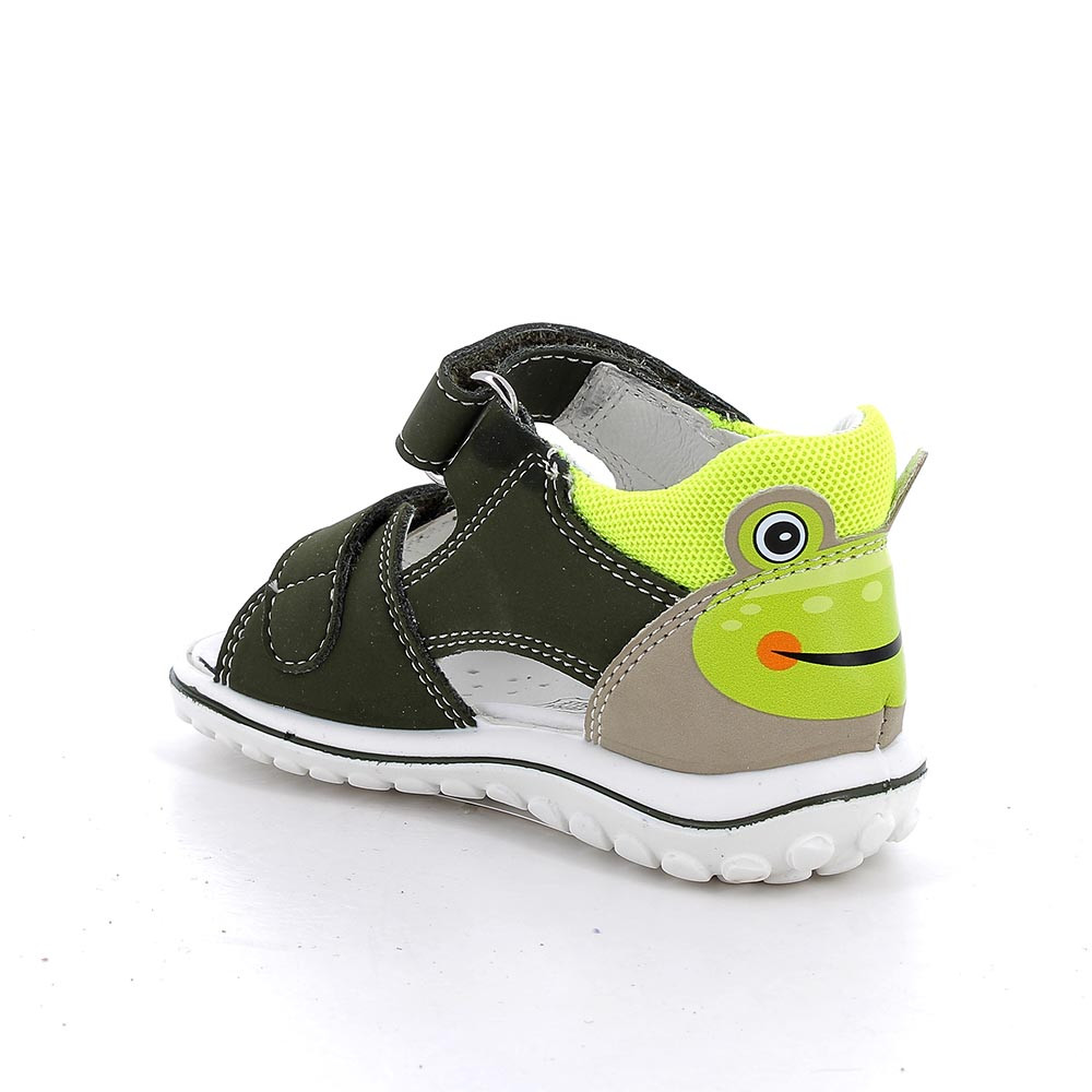 Open sandals designed for little ones, ideal for the hot season. The double velcro closure allows for easy and secure adjustment, ensuring stability during movement. On the back, the decorative detail in the shape of animal adds a playful and eye-catching touch. The insole is made of leather and offers a soft and breathable surface. The flexible sole equipped with a non-slip grip makes these first step sandals perfect for both indoor and outdoor activities.