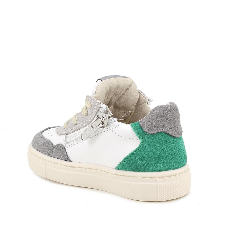 These first steps sneakers have a contemporary, urban style. They feature traditional laces, but also a practical internal zip. The leather lining offers a soft and breathable feel, ideal for keeping your feet fresh and comfortable throughout the day. The flat and durable sole ensures good grip and stability, making them perfect for everyday activities.