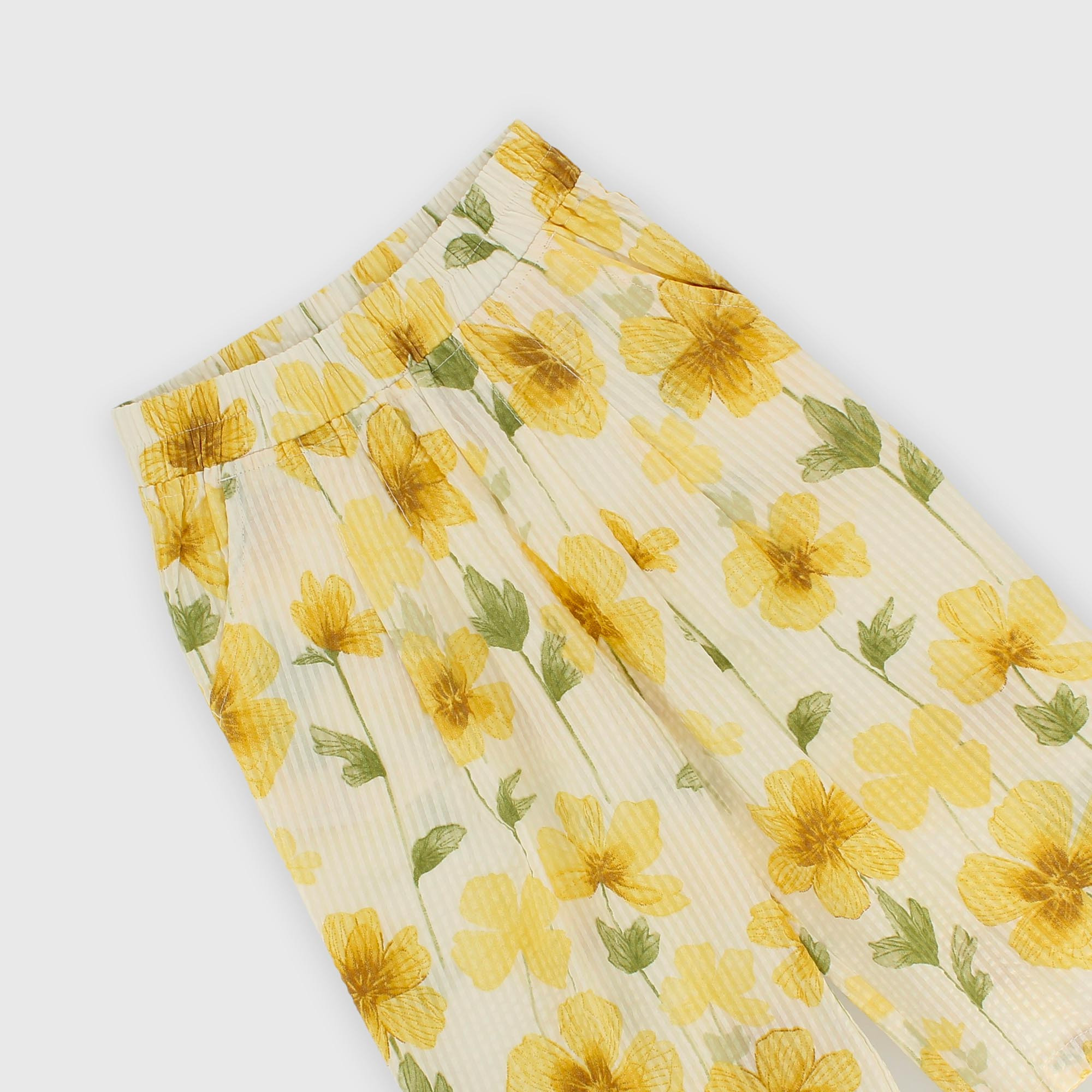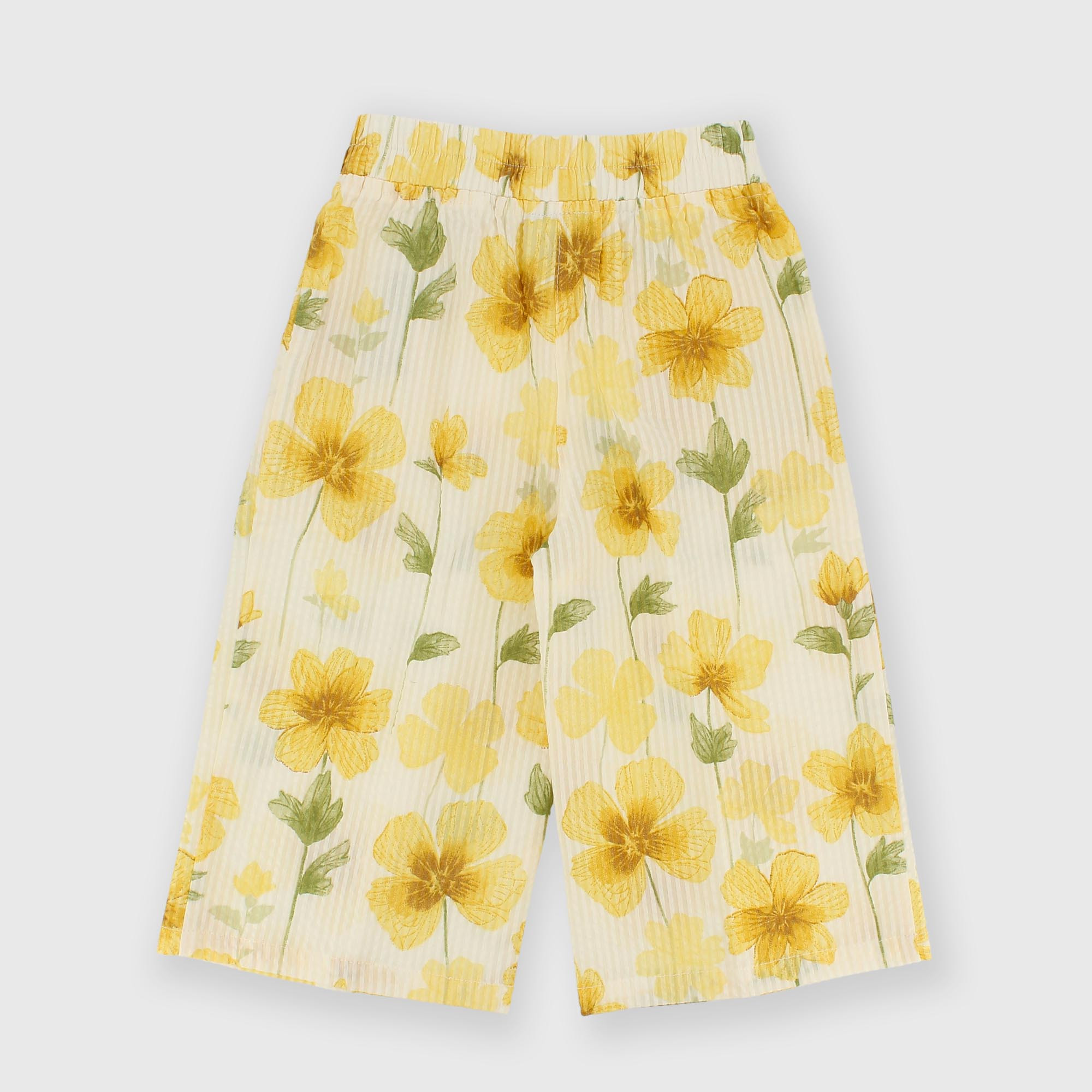 Wide-leg pants with an elastic waistband. French pockets. All-over floral print. Light embossed texture.