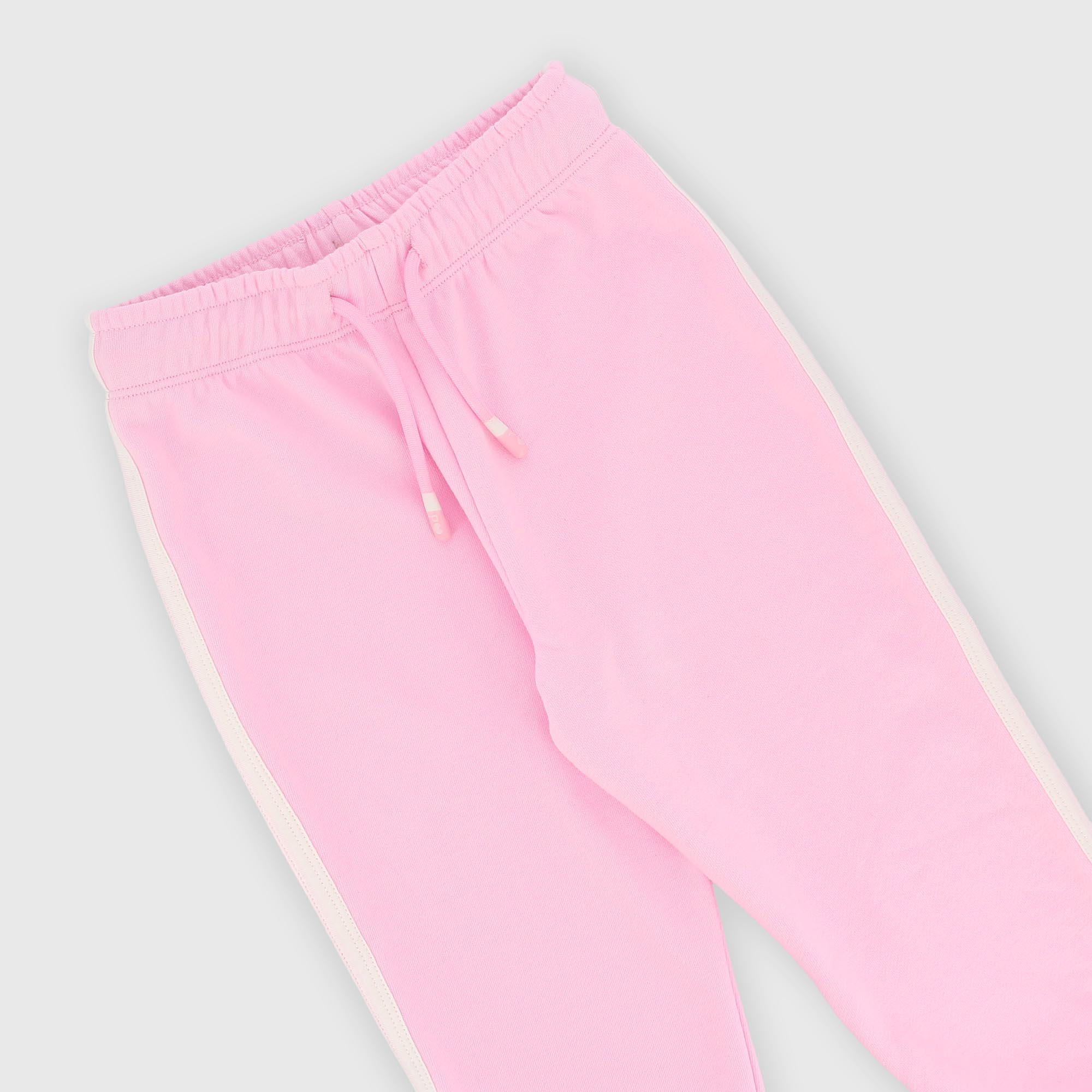 Fleece jogger pants with an elastic waistband and front drawstrings. Applied side stripes. Elastic cuffs.