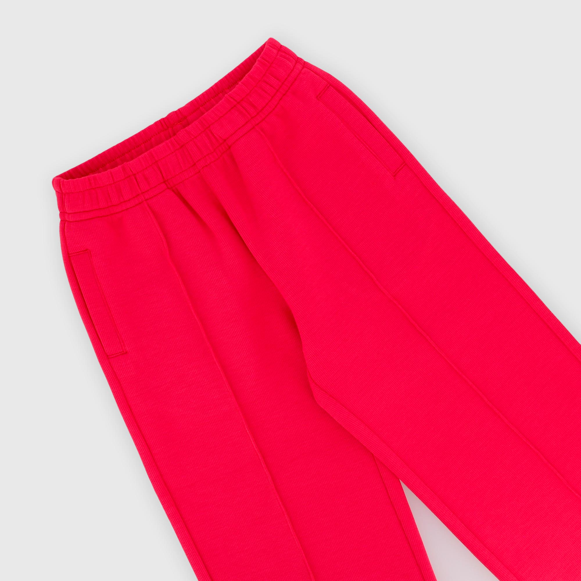 Wide-leg interlock pants with an elastic waistband. Center seam. Welt pockets.