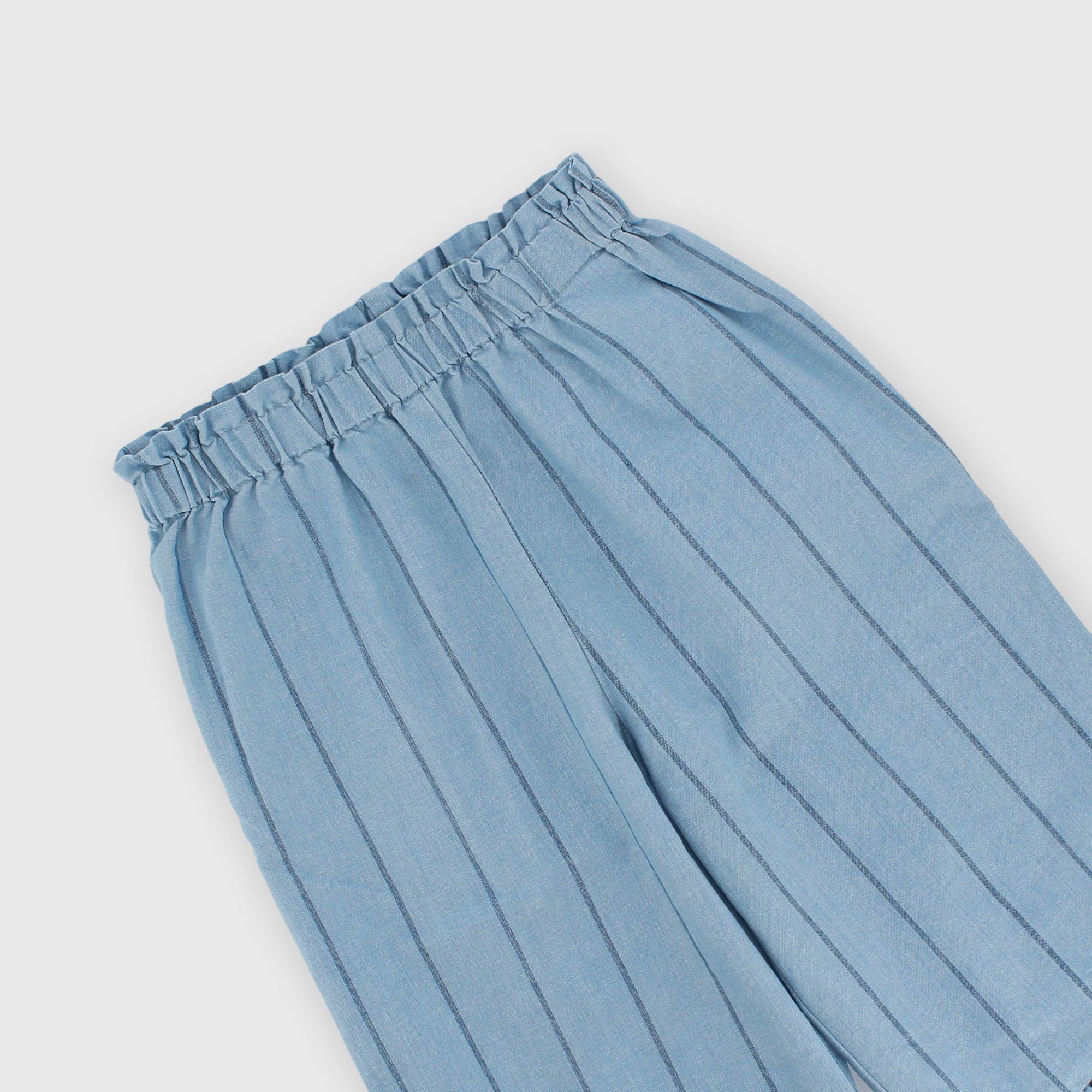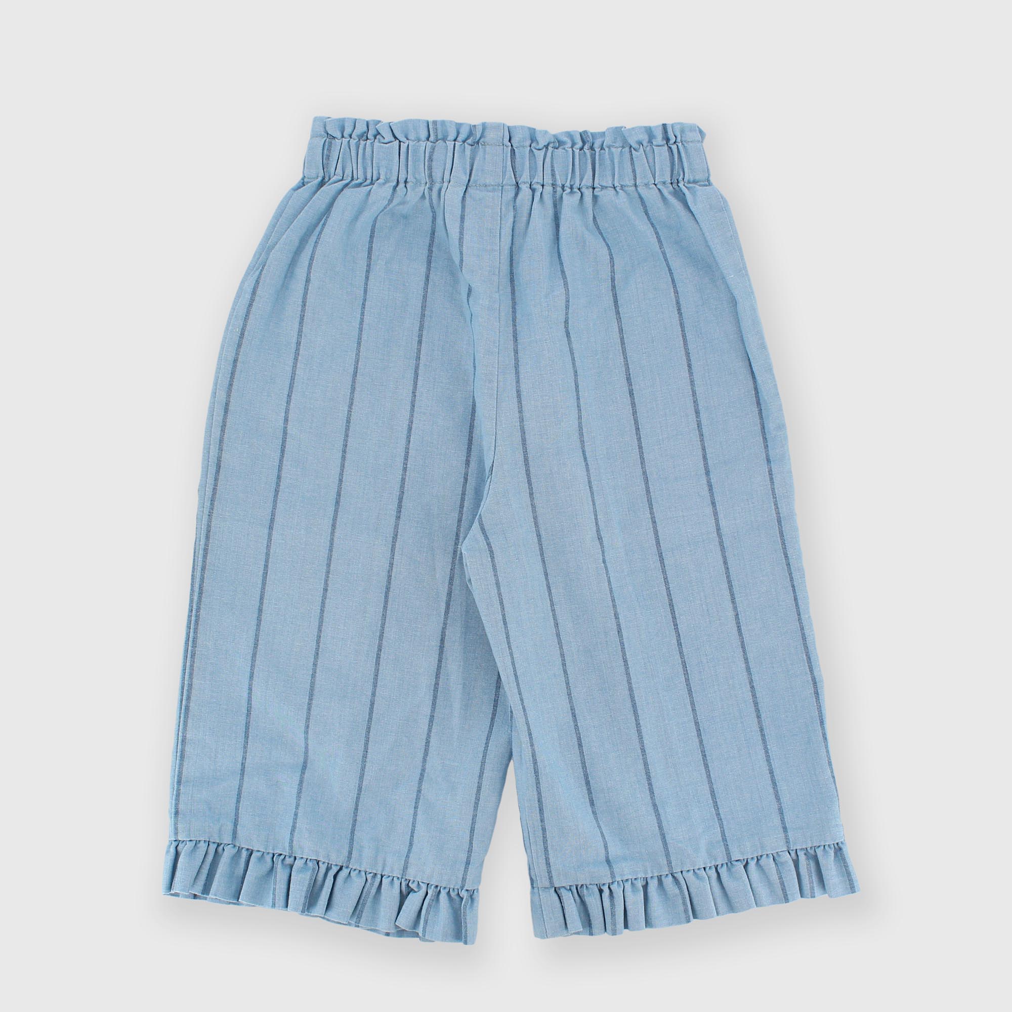 Wide-leg chambray striped pants with an elastic waistband. Ruffles at the hem.