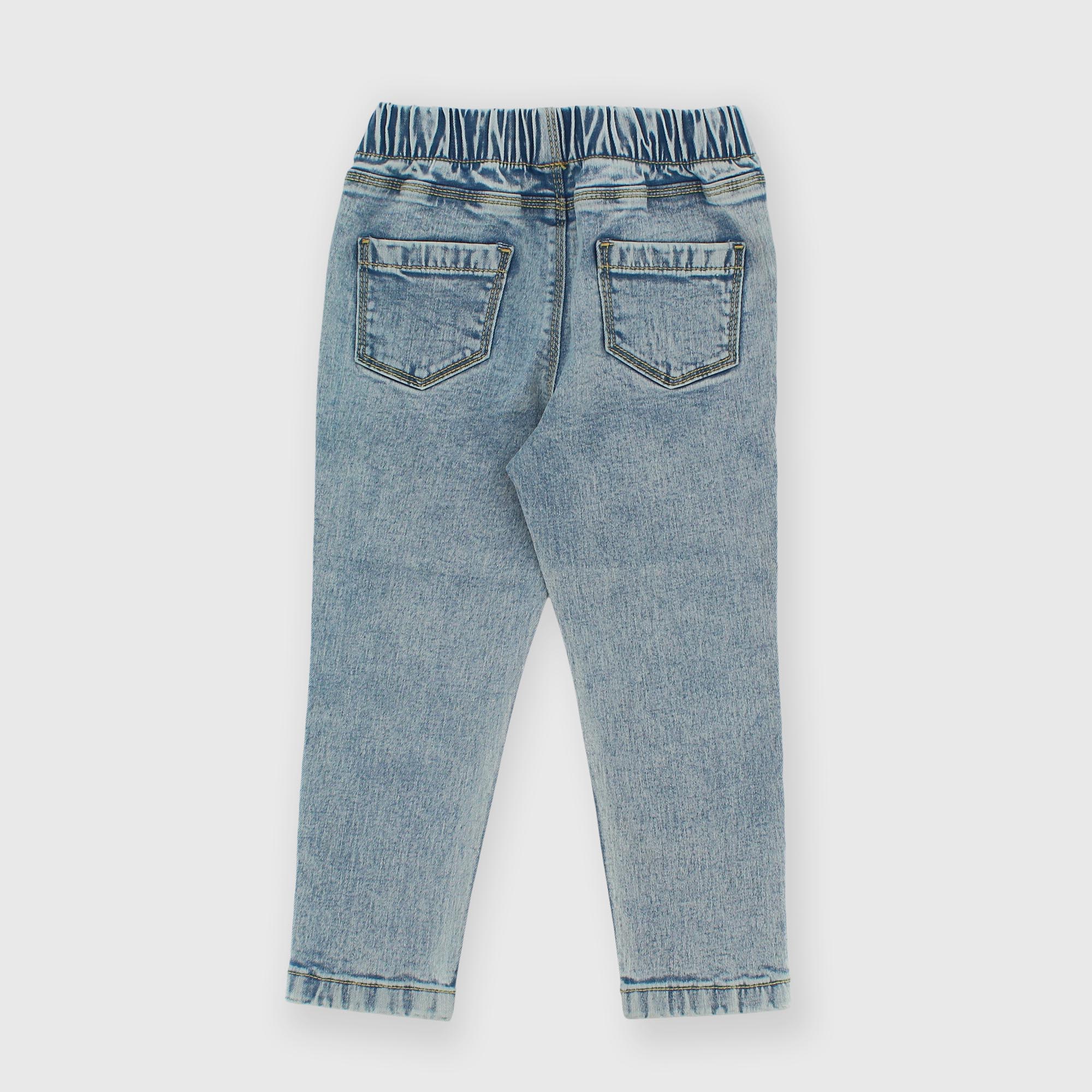 Jean jeggings with an elastic waistband. Fake pockets on the front and patch pockets on the back.
