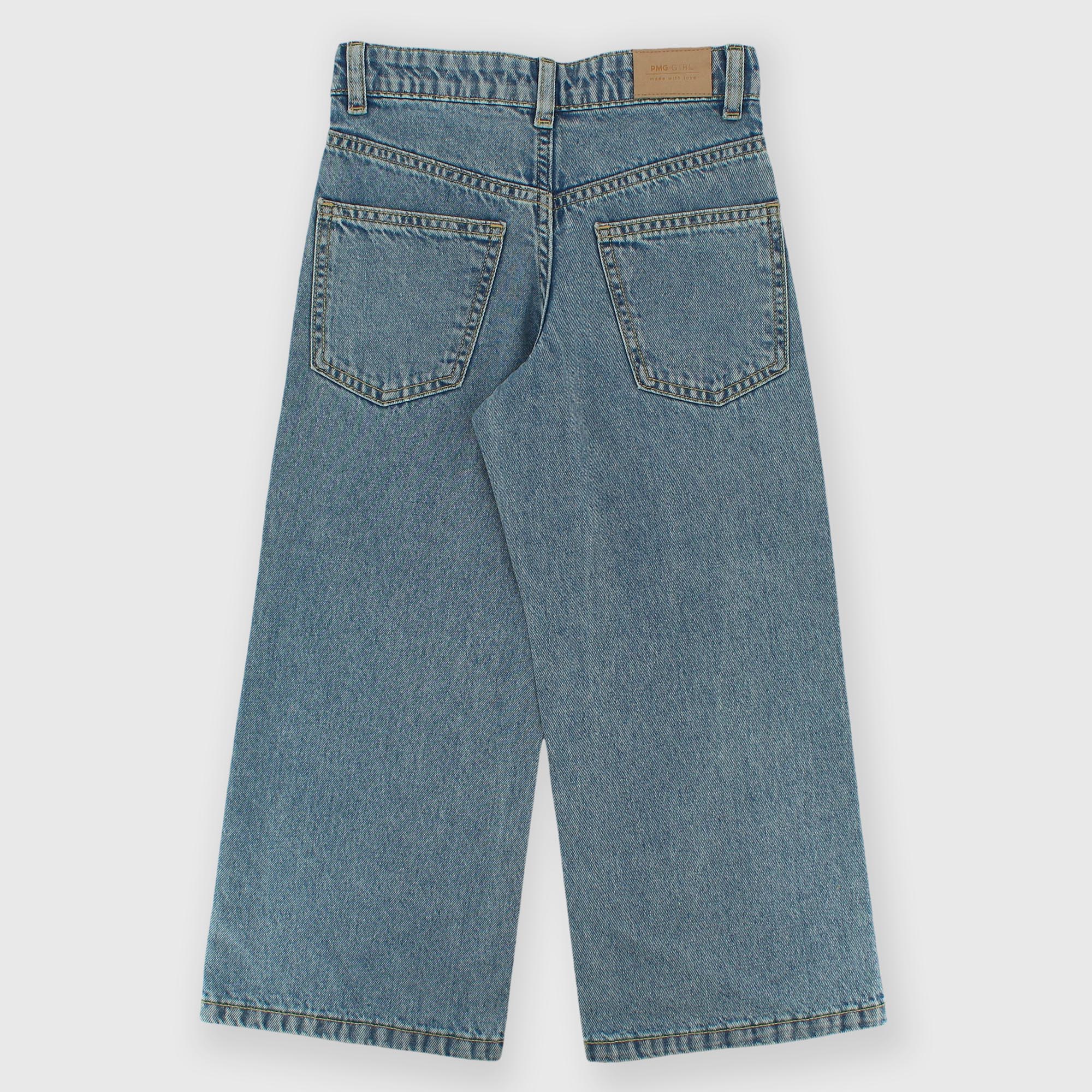Wide-leg jeans with an adjustable elastic waistband. Button and zip closure. Five pockets.