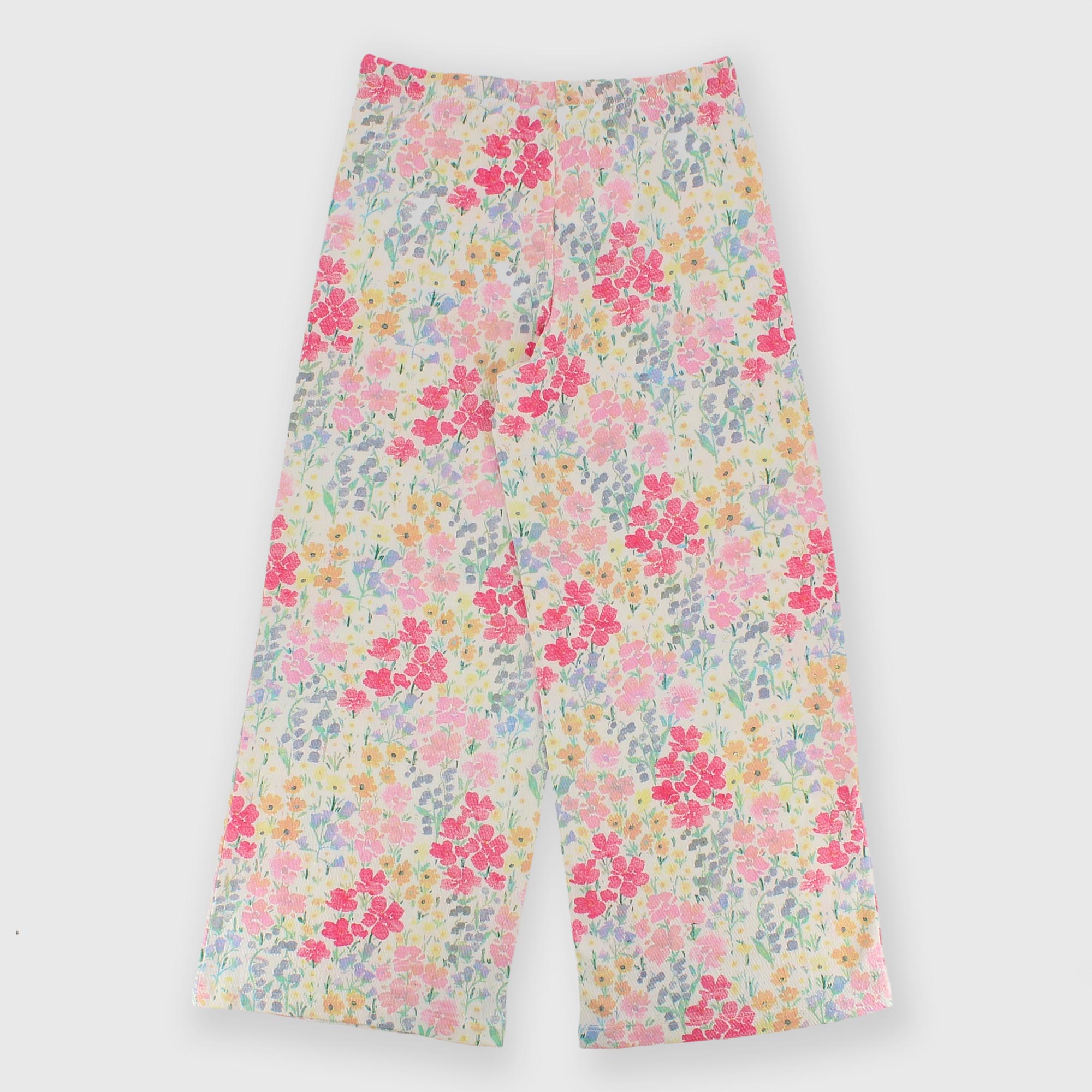 Wide leg seersucker trousers with elasticated waistband and front laces. All-over print with multicolored flowers.