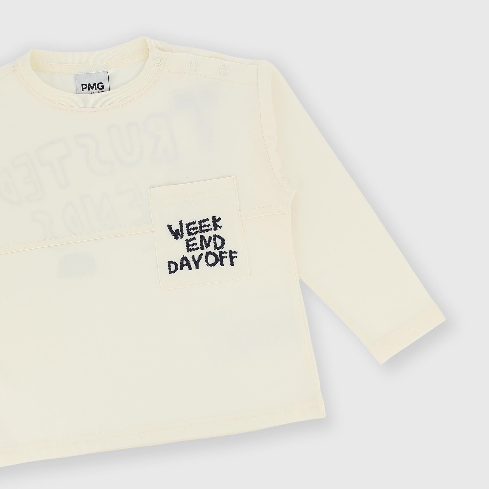 Jersey t-shirt, crew neck, long sleeves. Snap button closure on the shoulder. Pocket with embroidered lettering on the front. Print on the back.