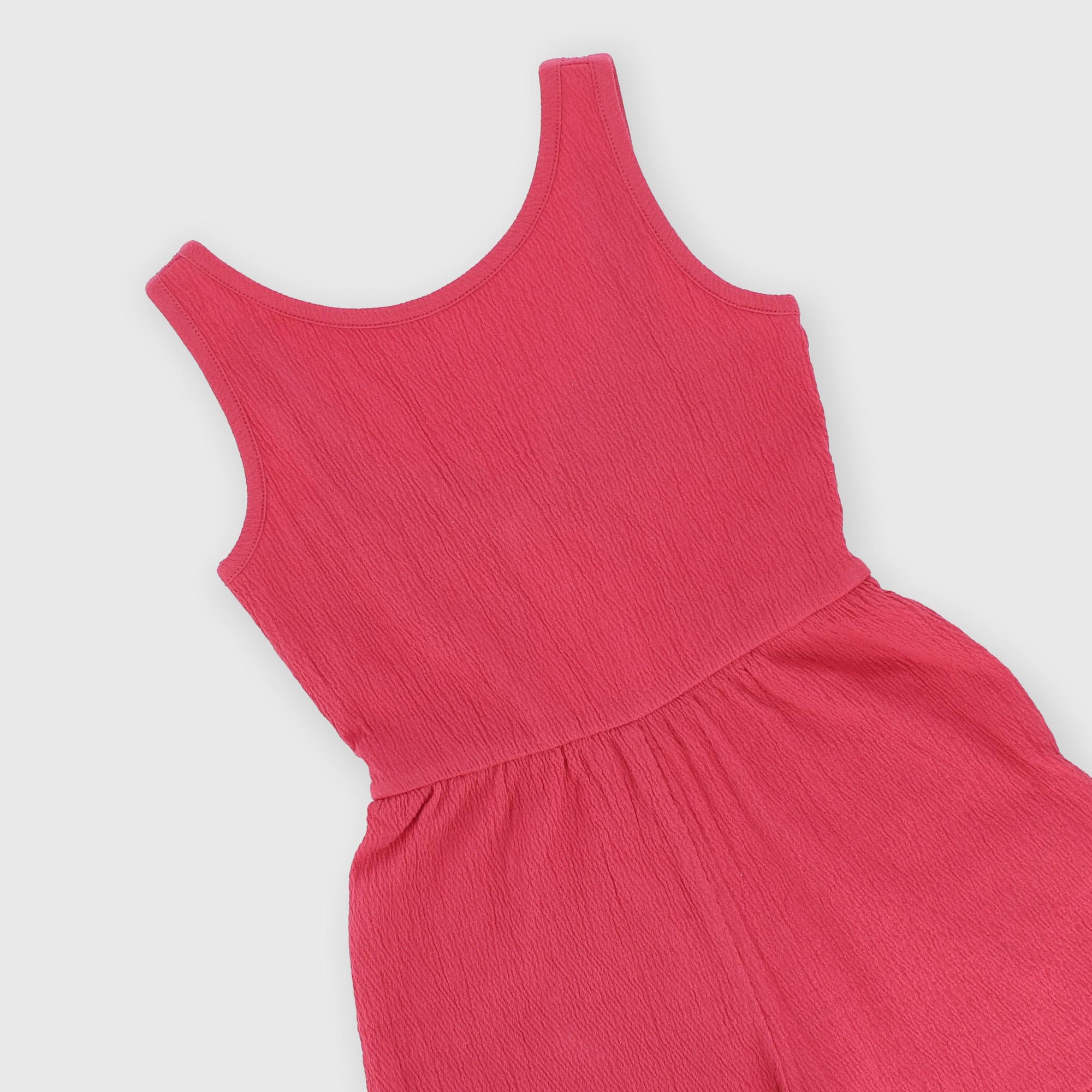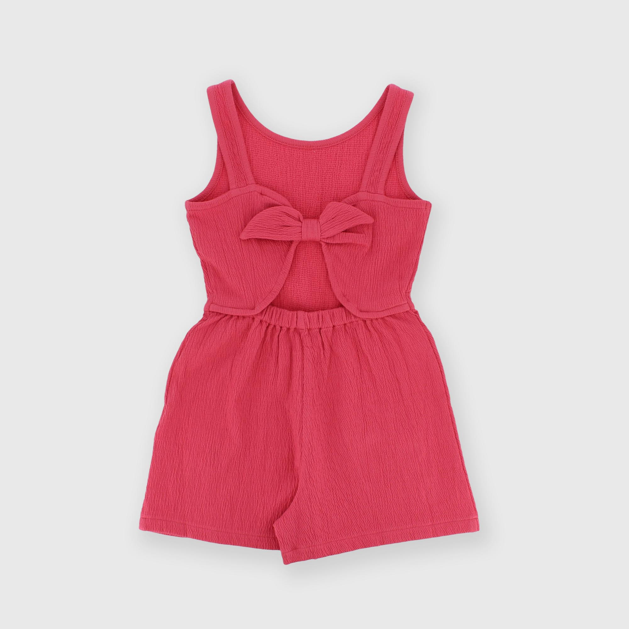 Seersucker overalls with a round neckline and straps. Back opening with an attached bow.