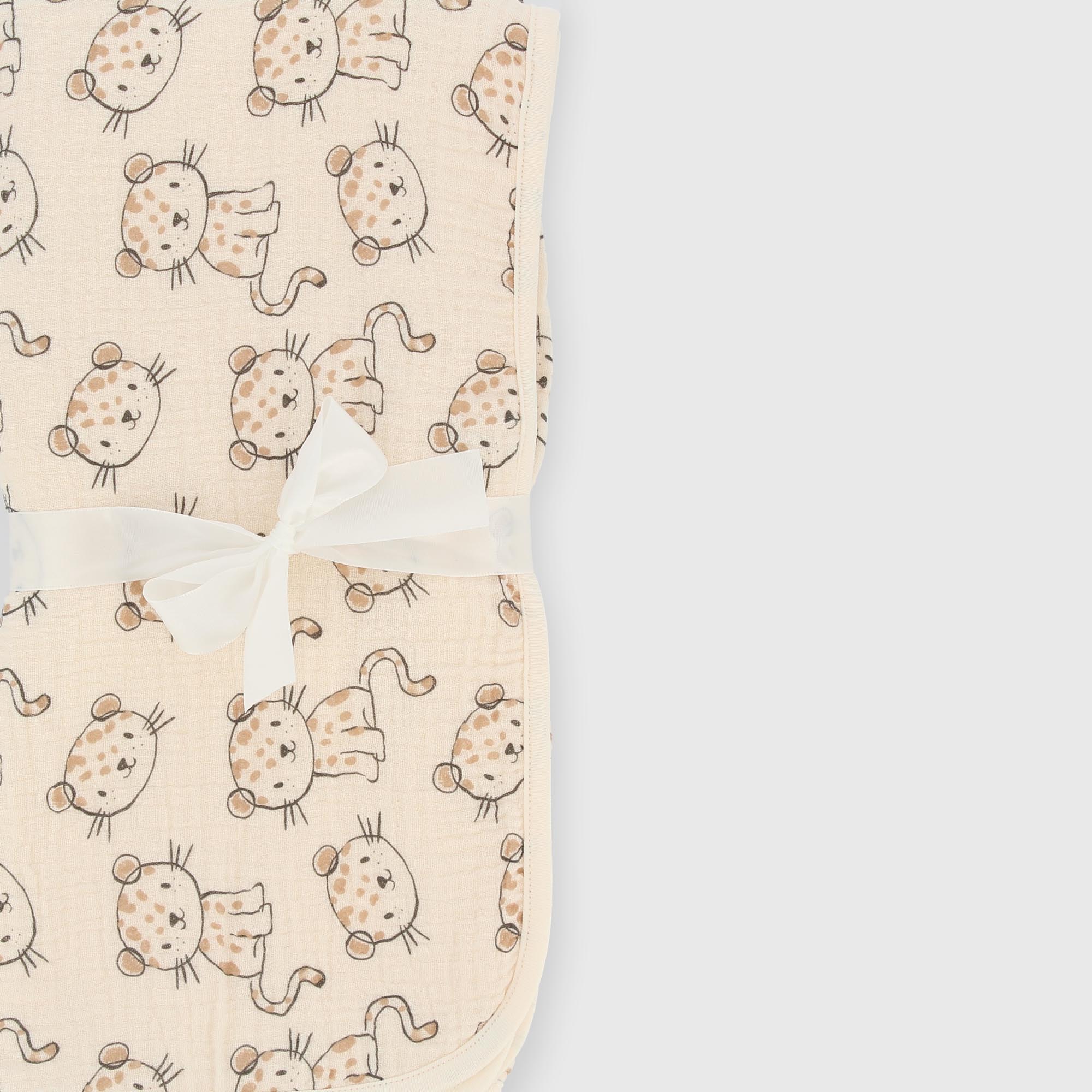 Baby cover: on one side made of cotton gauze with an all-over leopard print, on the other side in solid-colored interlock.