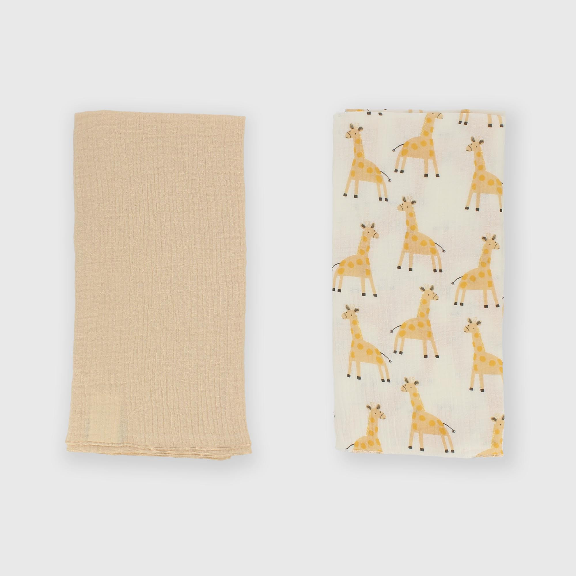Set consisting of two cotton gauze covers: one solid color, the other with an all-over giraffe print.