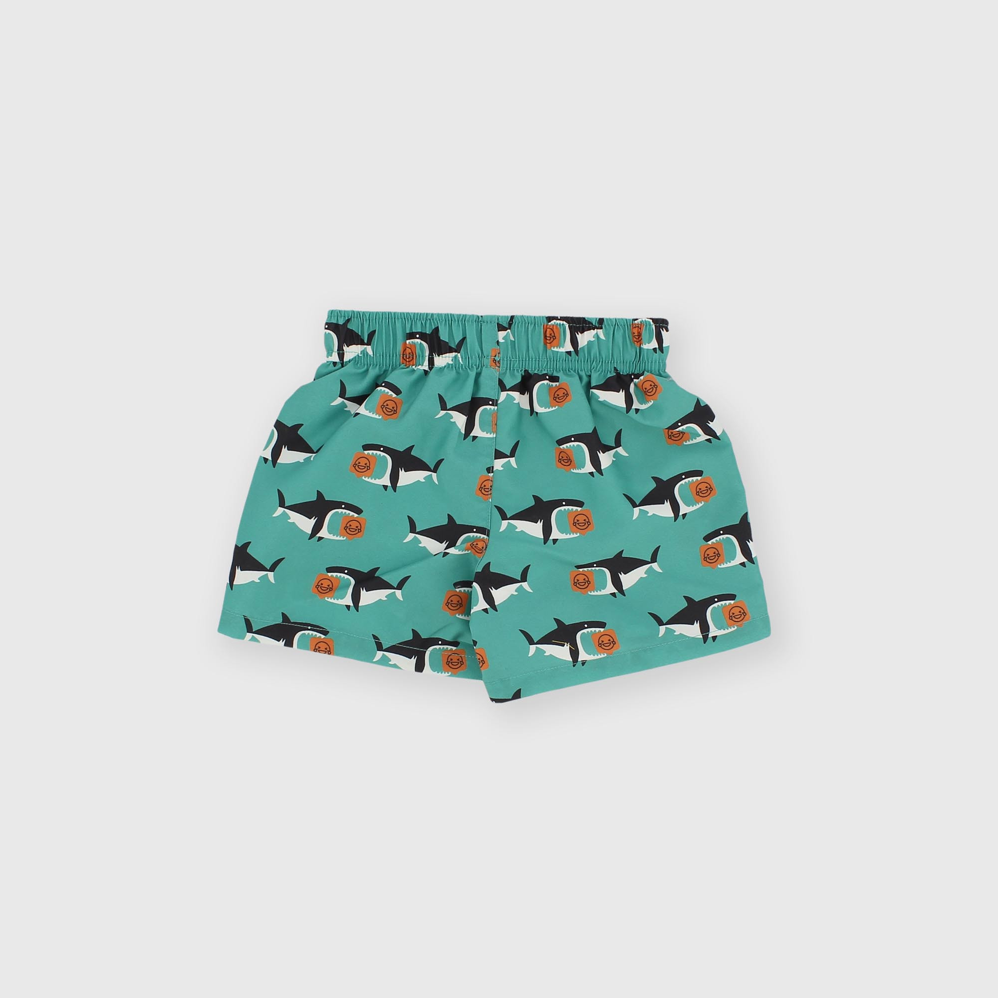 Swim shorts with an elastic waistband and front drawstrings. Inner micro-mesh briefs. Shark pattern.