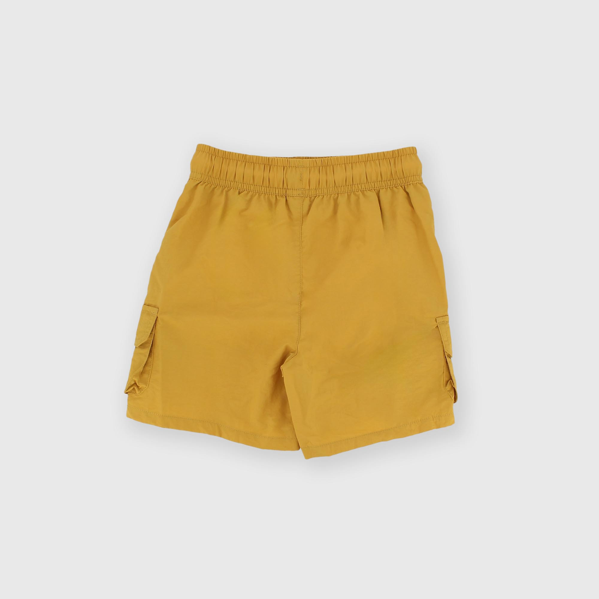Swim shorts with an elastic waistband and front drawstrings. Inner lining in micro-mesh. Patch pockets with flaps on the sides.