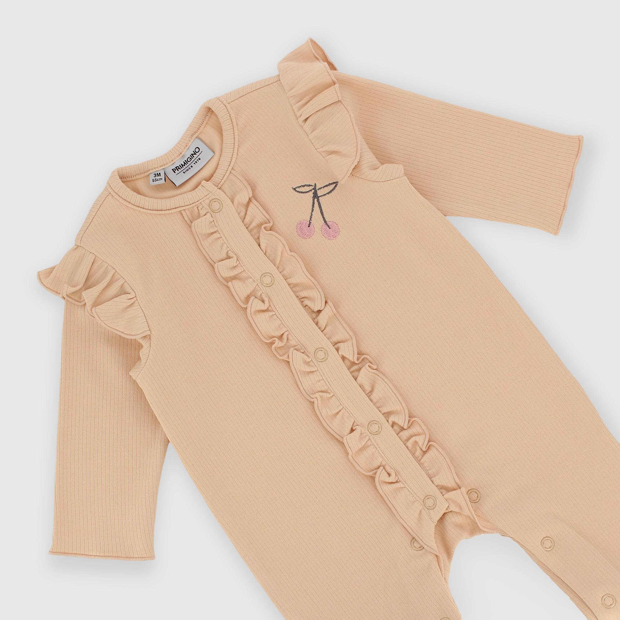 Ribbed romper, crew neck, with long sleeves. Front closure with snap buttons. Ruffled details on the shoulders and at the front. Small cherry print on the chest.
