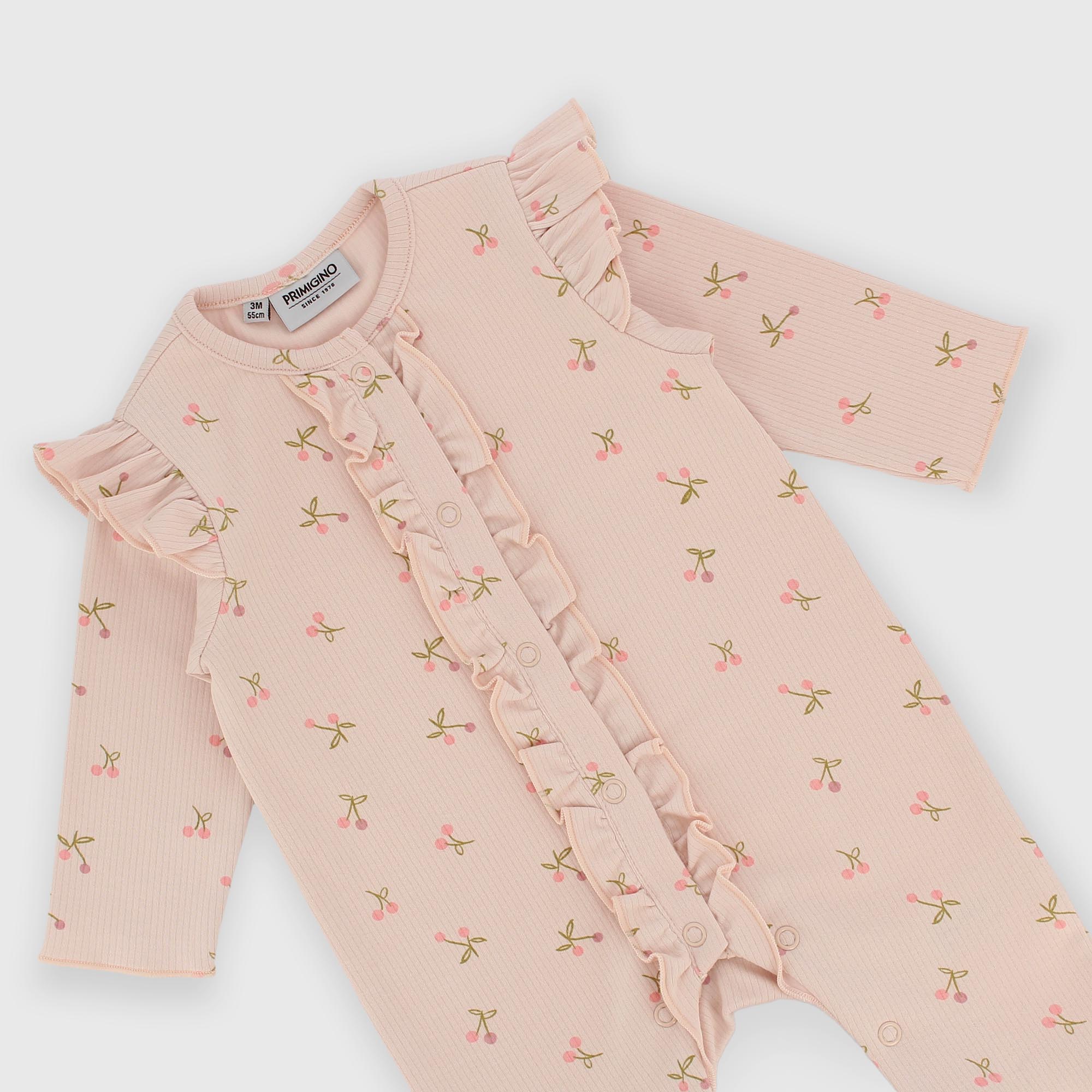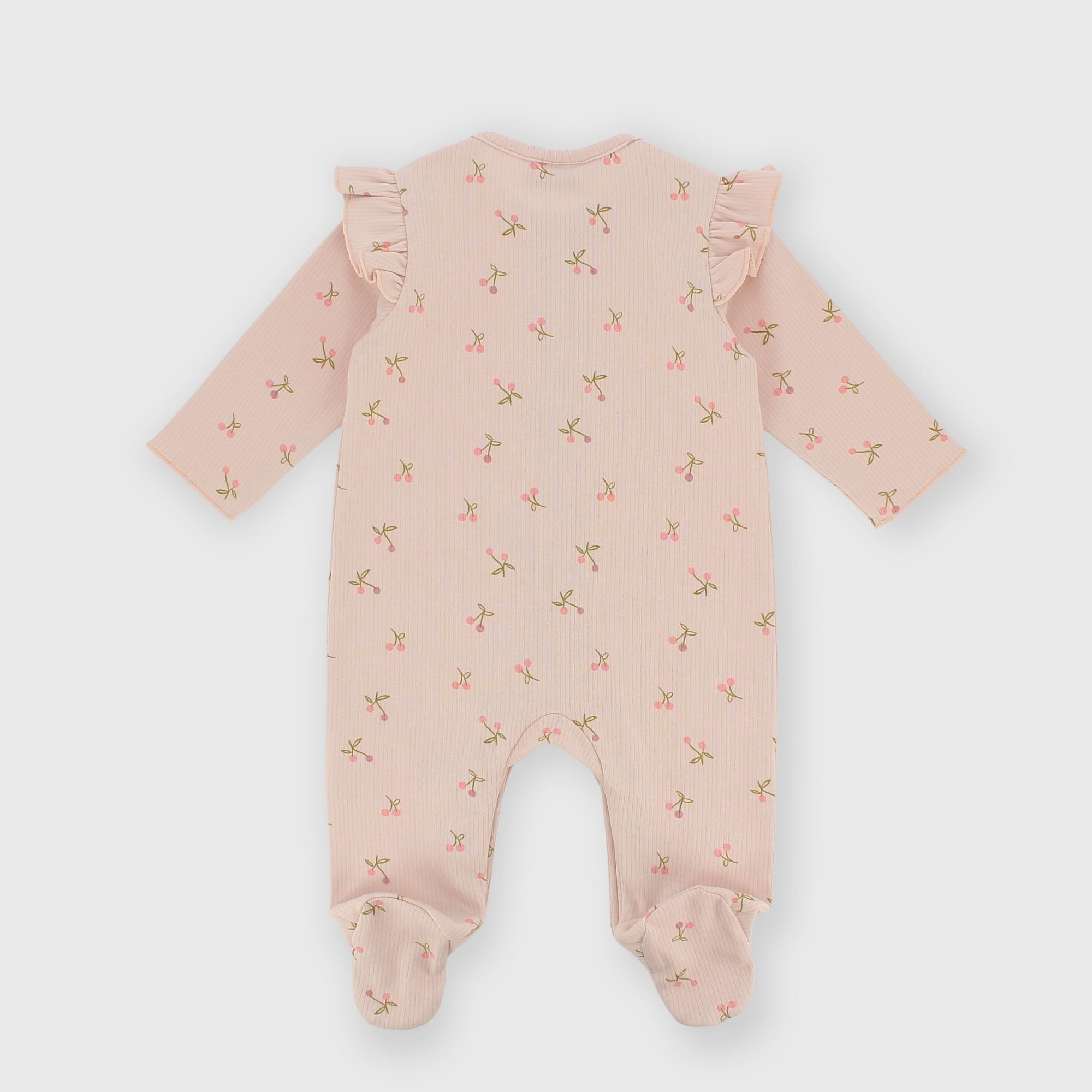 Ribbed romper, crew neck, with long sleeves. Front closure with snap buttons. Ruffled details on the shoulders and at the front. Cherry print all-over.