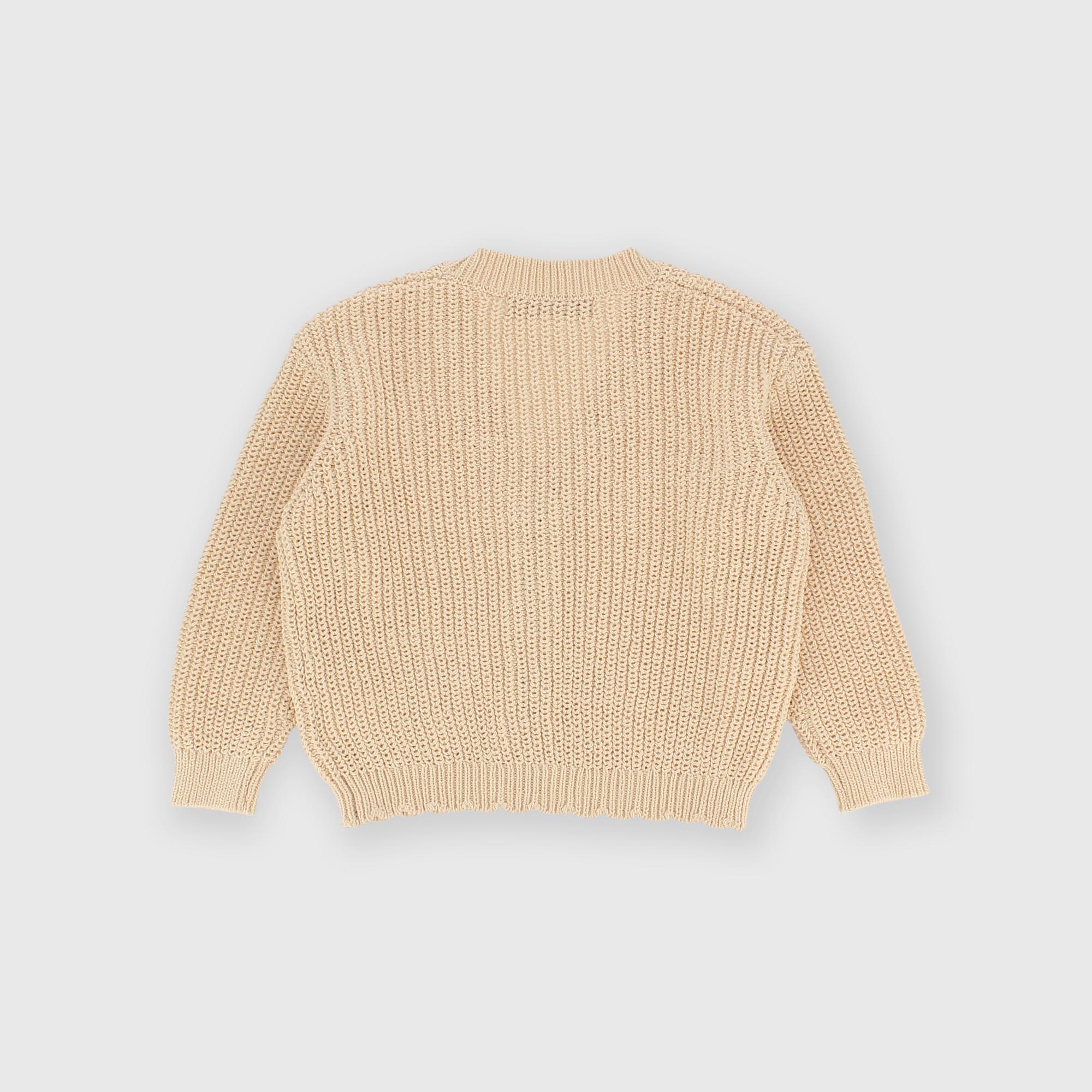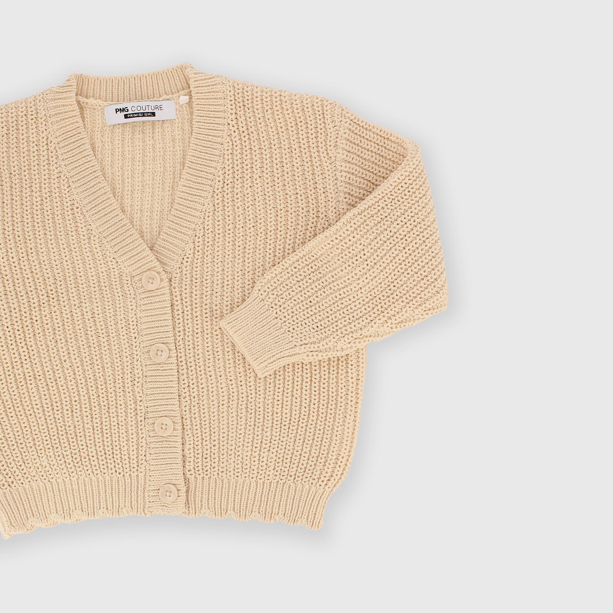 Soft knit cardigan with V-neck, long sleeves. Button closure on the front.