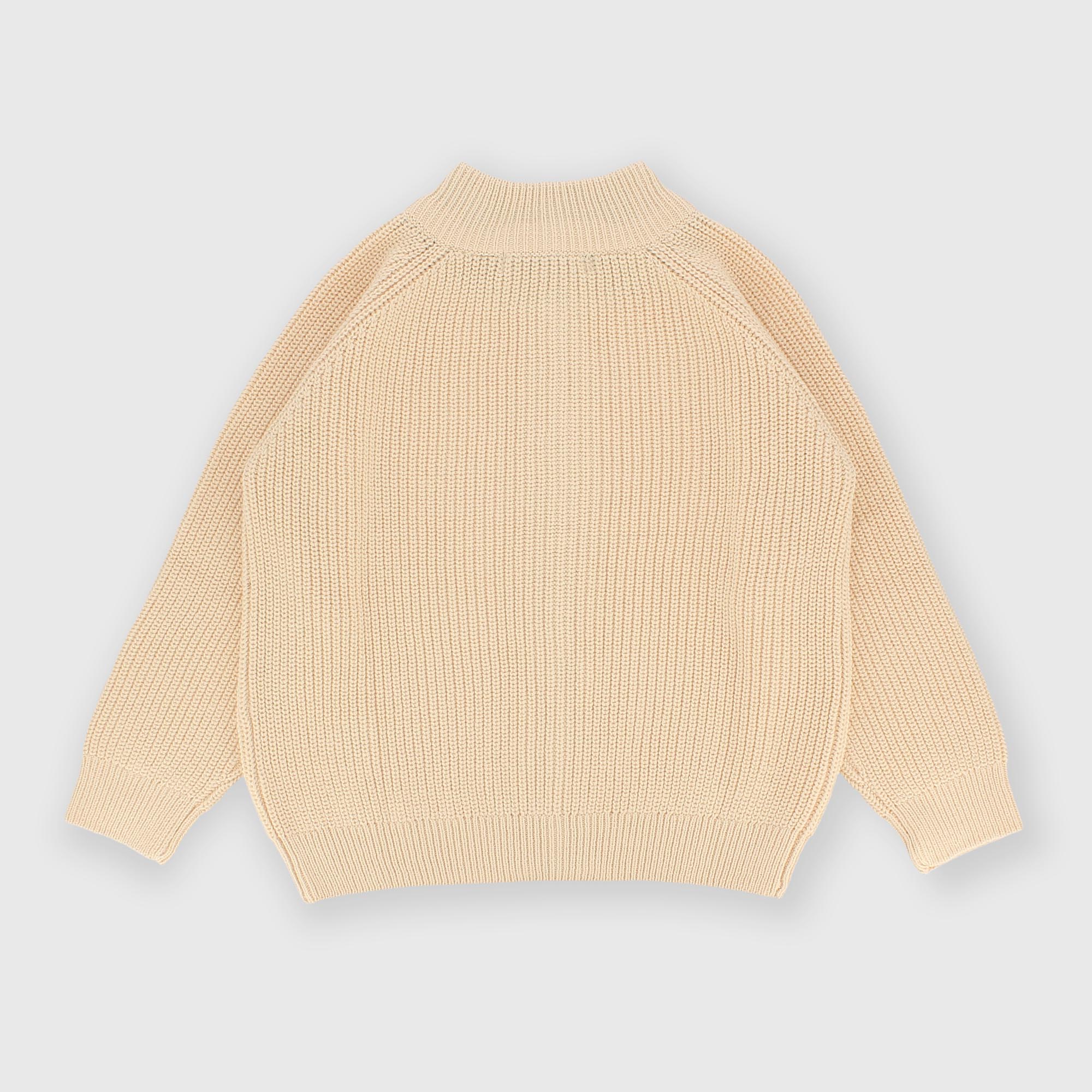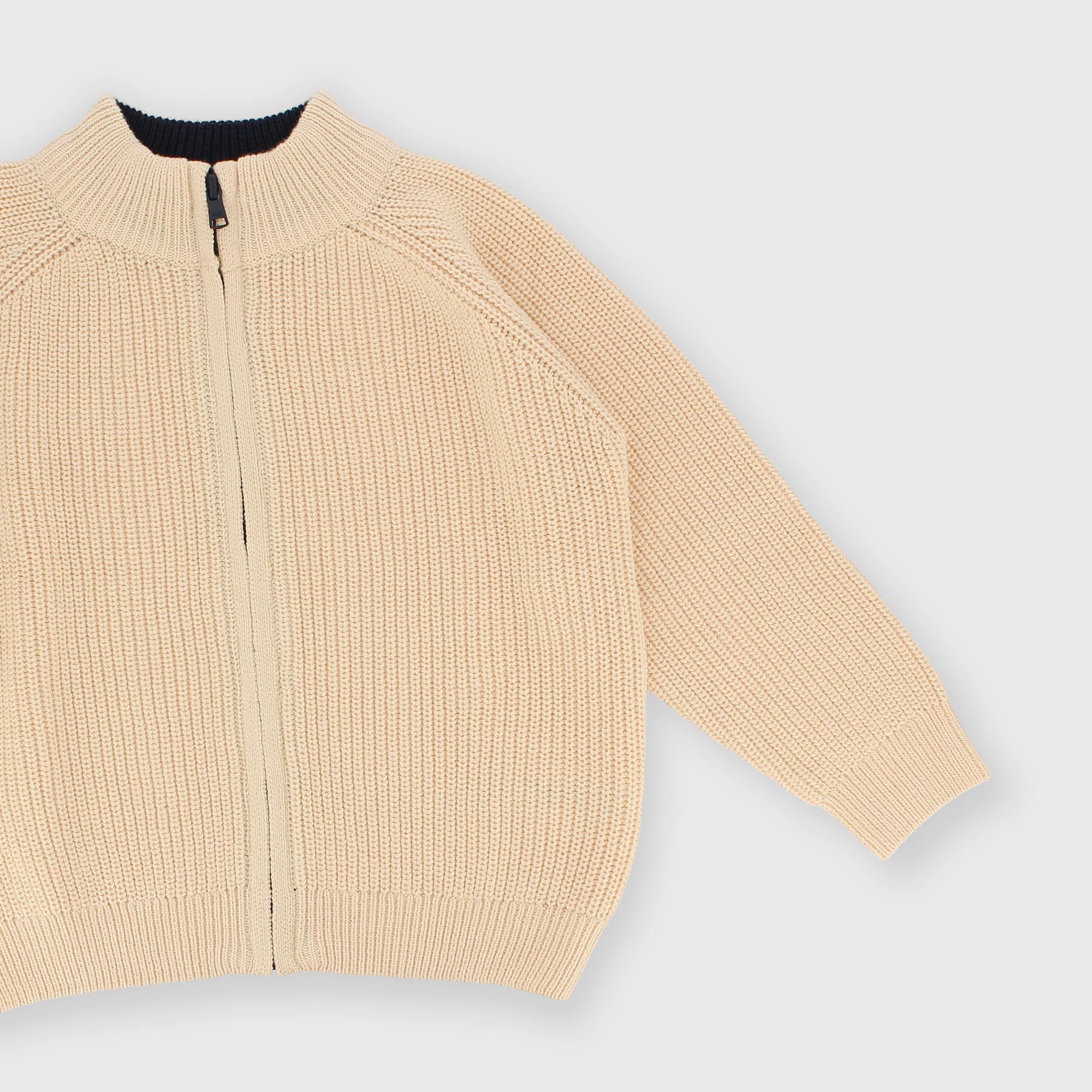 Soft knit cardigan, half collar, long sleeves. Front zip closure.