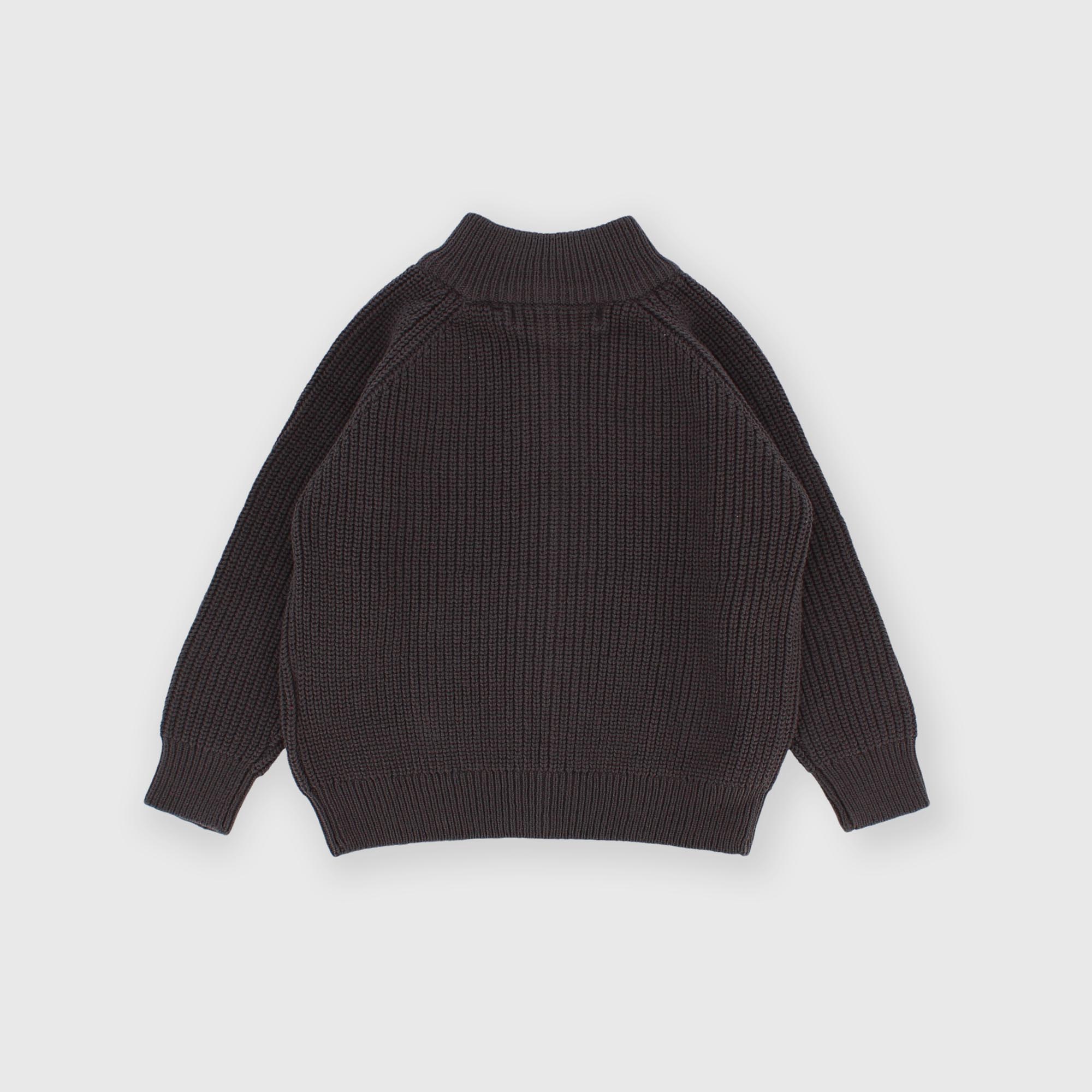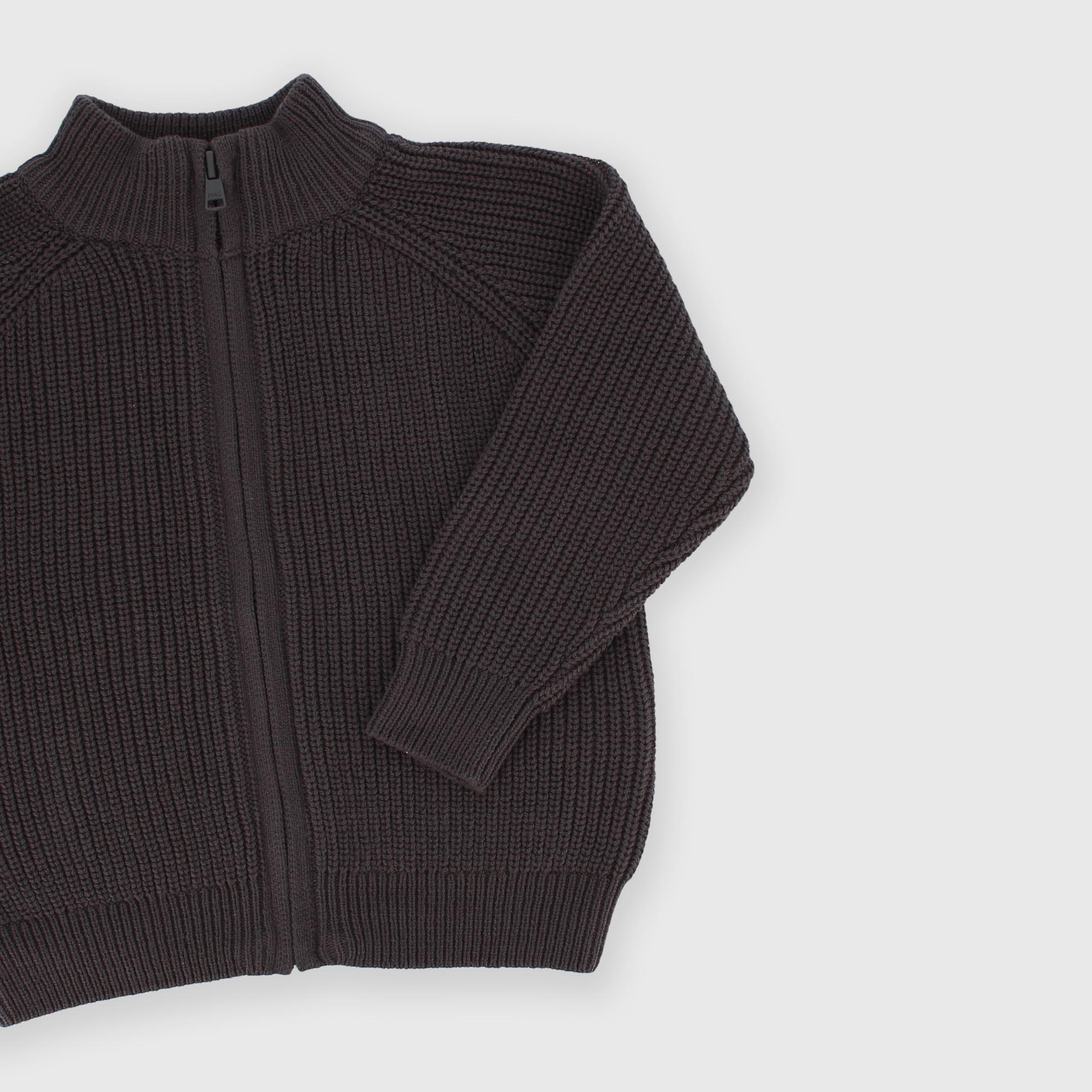 Soft knit cardigan, half collar, long sleeves. Front zip closure.