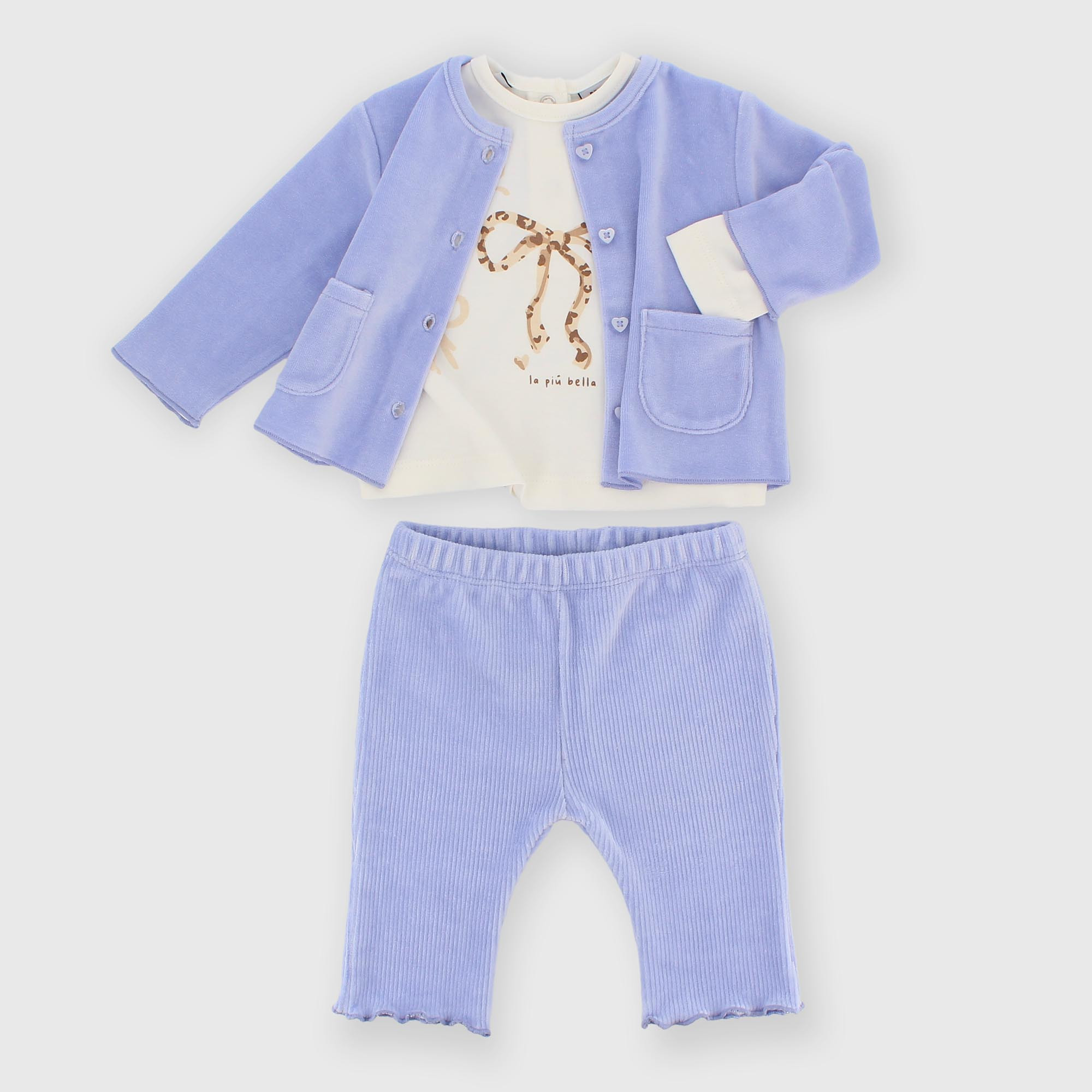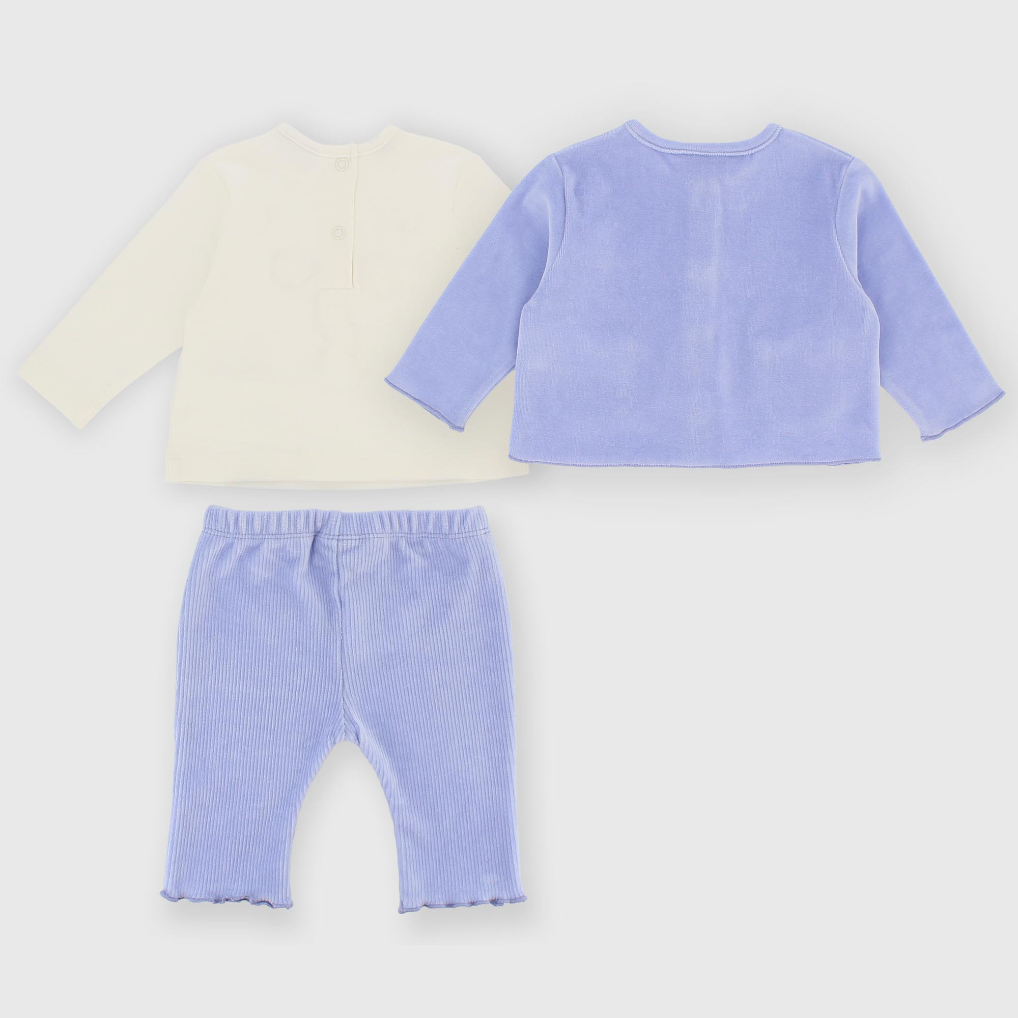 Complete set made up of three pieces. Long-sleeved cardigan with front button closure. Applied patch pockets. Warm cotton t-shirt, crew neck, long sleeves. Closure with snap buttons on the back. Print on the front. Pants with elastic waistband. Finished with doll stitch.