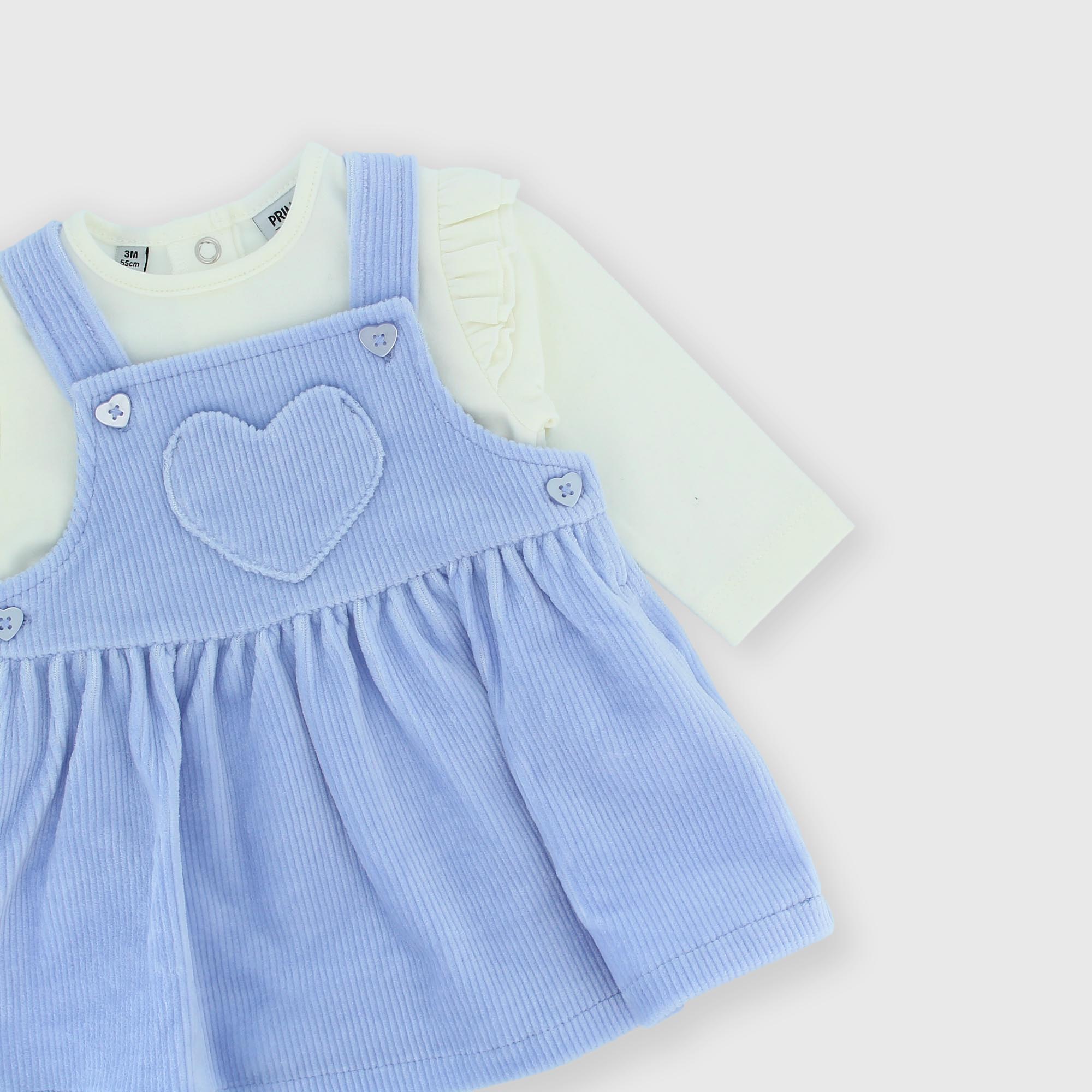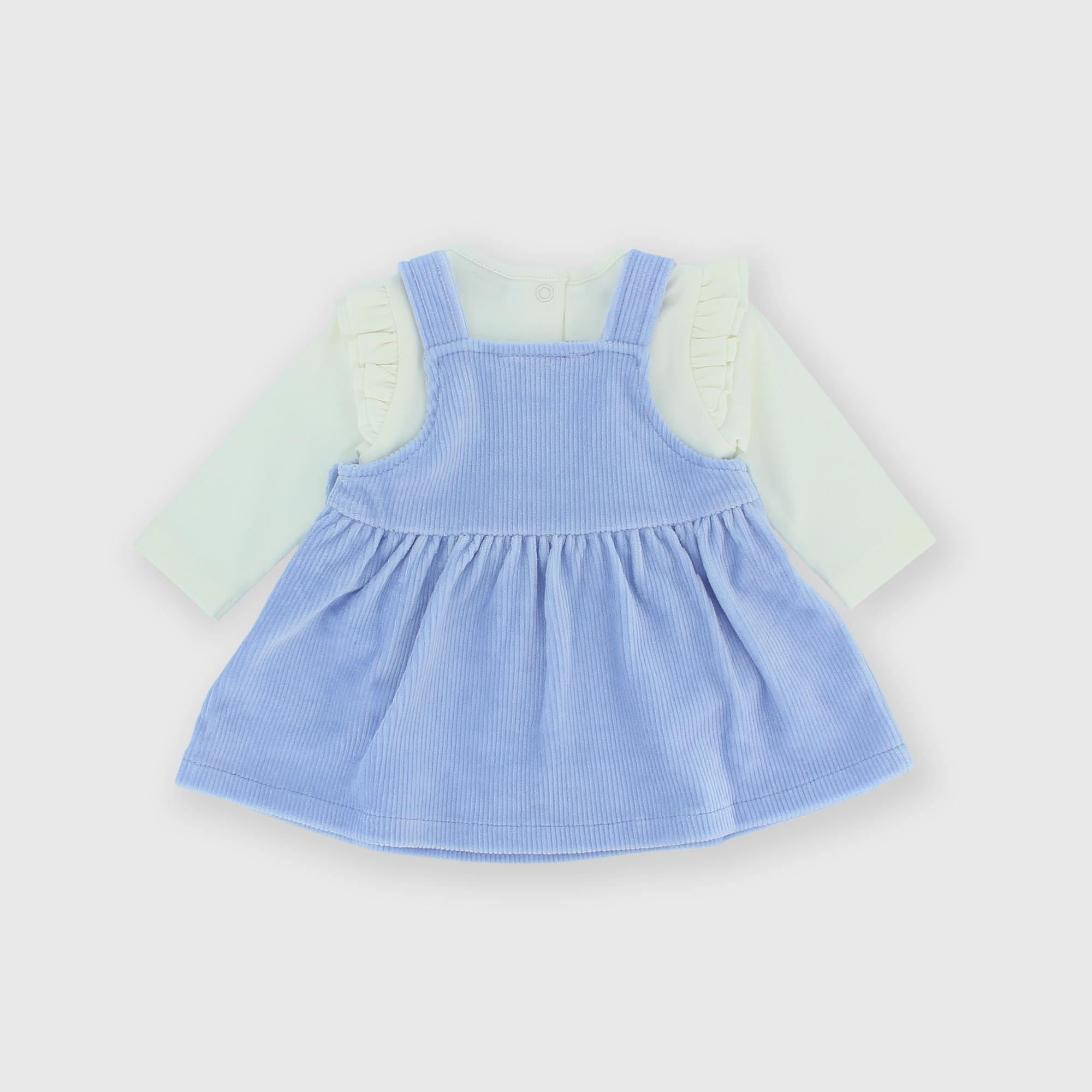 Complete set made of two pieces. Body in warm cotton. Crew neck, long sleeves. Closure with snap buttons at the back. Ruffles on the shoulders. Skirted overalls in chenille. Closure with buttons on the shoulders and on the side. Heart-shaped pocket on the front.
