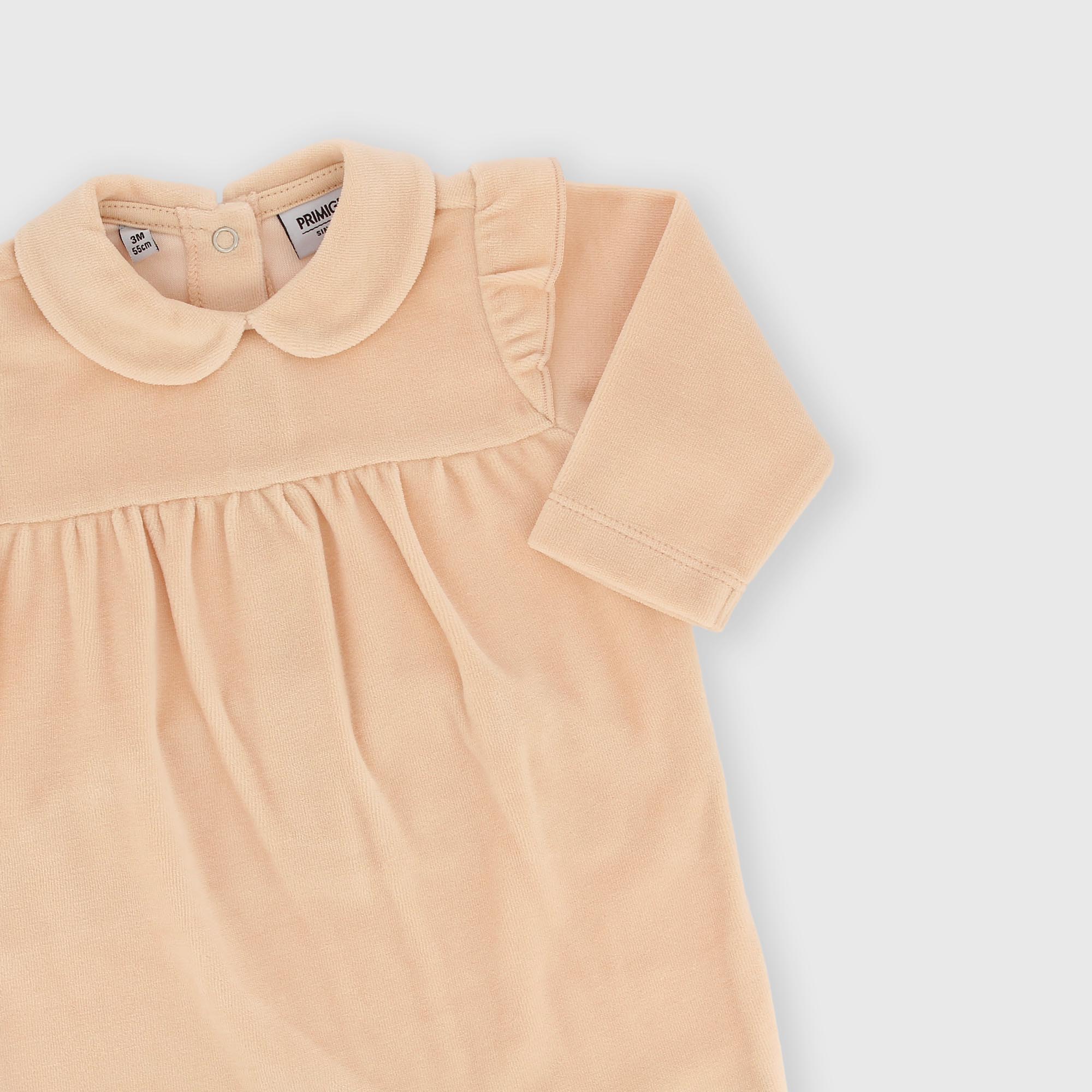 Chenille playsuit with Peter Pan collar and long sleeves. Back closure with snap buttons. Ruffles on the shoulders. Elasticated cuffs.